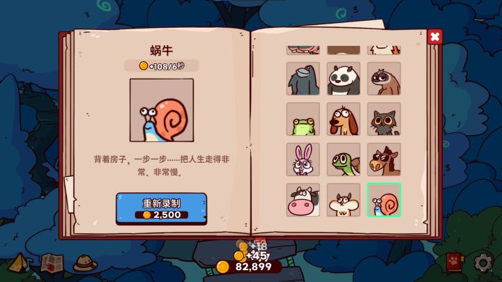 全图鉴解锁之后欣赏这堆动物,好多都呆呆傻傻的,眼神很睿智。每种动物只能领养一个,可能是为了避免泛滥成灾的动物把大家的耳朵吵死吧。我本来还想领养好多企鹅的,真的很可爱啊。所有动物都有一句有趣的描述,在解锁动物前就能看到。比如说奶牛的就是“任何早餐麦片的灵魂,都在这家伙身上。”