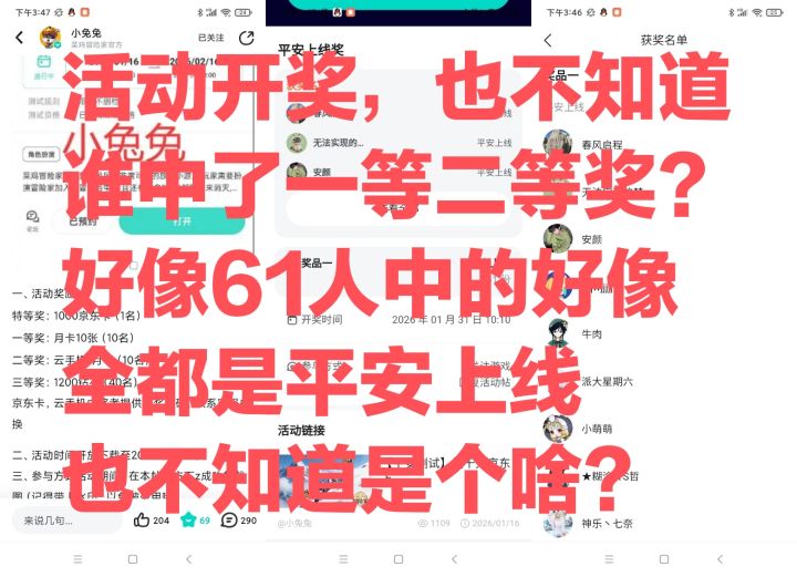 活动开奖,也不知道谁中了一等二等奖?好像61人中的好像全都是平安上线也不知道是个啥?一二等奖也不公示一下