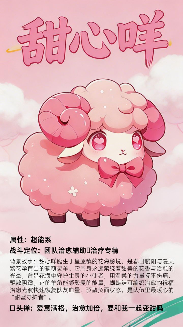 精灵名称:甜心咩潜力:s属性:超能系定位:治疗、远程精灵技能:攻击:【动感冲击】,发射动感光波攻击敌方单体,按照自身攻击力造成超能属性伤害战技:【急救甜心】,按照自身攻击力为生命值最少的己方单位回复生命值,战技冷却时间为10秒,己方单位生命值低于20%时,立刻释放额外战技【急救甜心】,且不占用战技冷却时间,每30秒最多触发一次终结技:【治愈之歌】,按照自身攻击力为最多3名生命值最少的