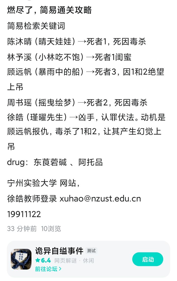 简易检索关键词陈沐晴(晴天娃娃)→死者1,死因毒杀林予溪(小林吃不饱)→死者1闺蜜顾远帆(暴雨中的船)→死者3,因1和2绝望上吊周书瑶(摇曳绘梦)→死者2,死因毒杀徐皓(瑾曜先生)→凶手,认罪伏法。动机是顾远帆报仇,毒杀了1和2,让其产生幻觉上吊drug: 东莨菪碱 、 阿托品宁州实验大学 网站,徐皓教师登录 xuhao@nzust.edu.cn 19911122