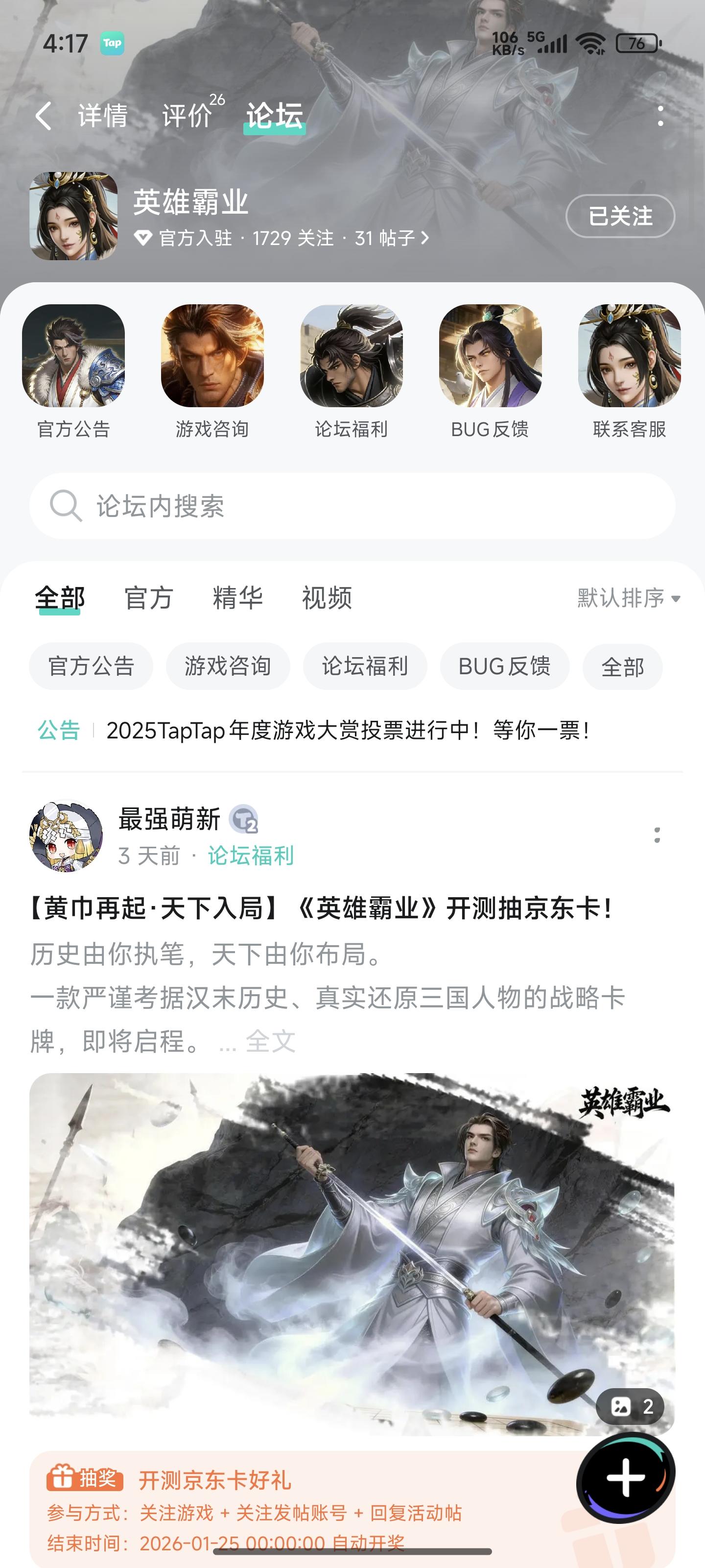 狭路相逢,王者为尊!京东卡福利等你来拿!参与方式简单便捷,只需提前预约,即可有机会赢取大奖!专属福利:【京东卡抽奖活动】▶ 参与方式1.点击关注发帖账号并预约《英雄霸业》2.在本帖下方评论区分享发帖链接即可【奖品发放】到达开奖时间后,由taptap系统随机抽取符合要求的幸运玩家,自动发放兑换码(对于同一账号大量故意发布评论刷楼层导致其他玩家中奖概率降低的行为的用户,将会可能被取消参与资格!