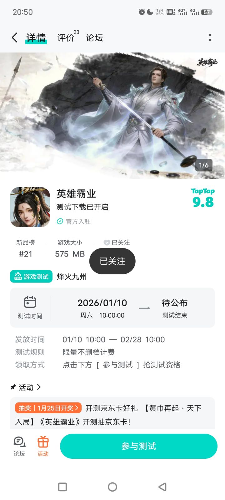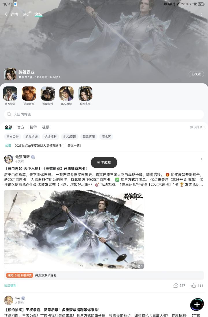狭路相逢,王者为尊!京东卡福利等你来拿!参与方式简单便捷,只需提前预约,即可有机会赢取大奖!专属福利:【京东卡抽奖活动】▶ 参与方式1.点击关注发帖账号并预约《英雄霸业》2.在本帖下方评论区分享发帖链接即可【奖品发放】到达开奖时间后,由taptap系统随机抽取符合要求的幸运玩家,自动发放兑换码(对于同一账号大量故意发布评论刷楼层导致其他玩家中奖概率降低的行为的用户,将会可能被取消参与资格!