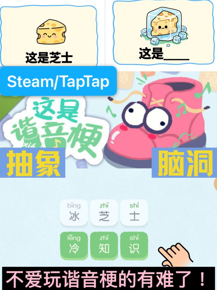 🎮这是谐音梗🕹️文字丨休闲丨解谜💻Steam(demo可玩)/TapTap(预约中) 🫶🏻好消息!正式版也是免费的!包含 500+ 官方题目,来自超过 13 位作者授权。 🖼️玩法就是魔性的插画猜谐音梗,有8次机会猜答案,有的是四字成语,有的是2-3字的词语。不得不说作者大大的脑洞真的太大了🧠每一关都笑得我花枝乱颤(本熊🐻笑点极低👉🏻👈🏻) 💛一块姜做出比心的动作就叫将心比心,两只