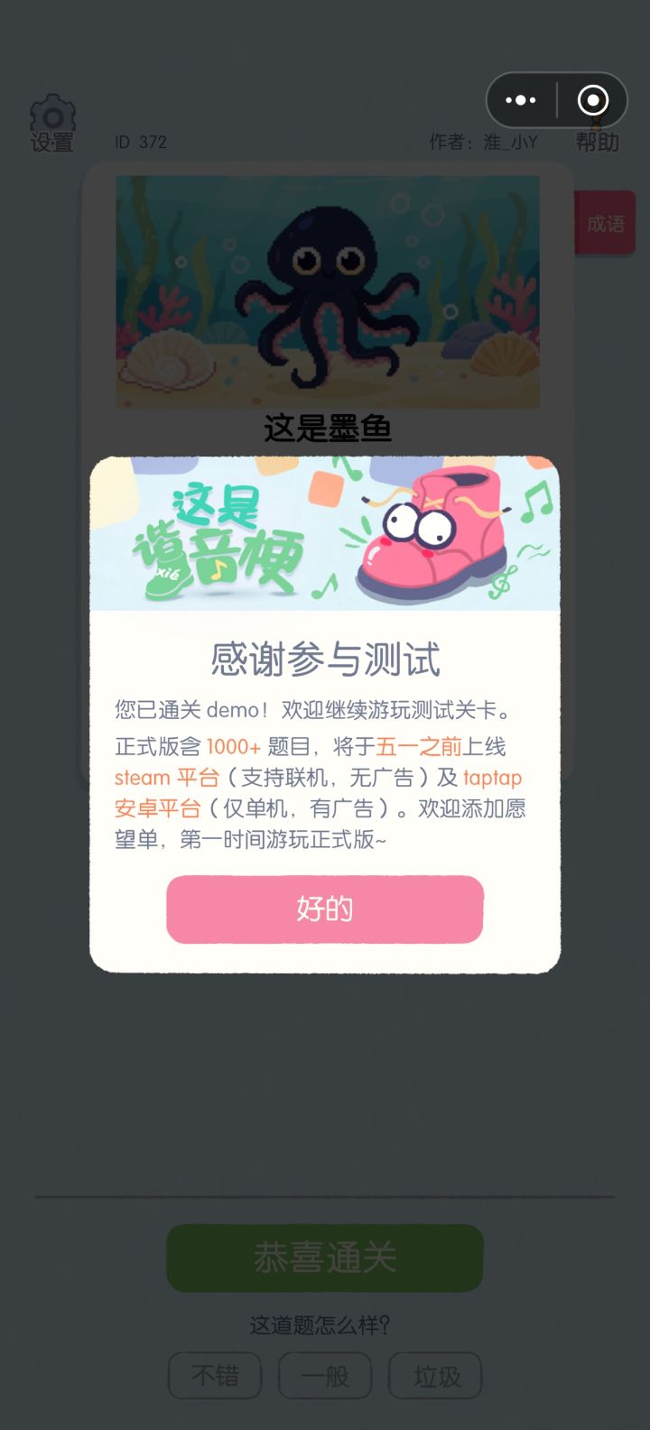 ⭐⭐⭐⭐(4/5)推荐理由:免费、轻量、搞笑、耐玩,是 Tap 上近期很值得一试的休闲小品。这是一款轻量搞笑、脑洞大开的谐音梗猜谜休闲小游戏,本来只是随便点开玩玩,把谐音梗结合热搜,加上汉字的趣味性,真的很不错,目前还在测试阶段,Tap 期待值9.4分,适合摸鱼、情侣、聚会、打发碎片时间,谐音梗爱好者必玩。今天跟对象玩到火腿肠梗的时候,笑了~哈哈哈,🔥长了两个腿,乐了。其实后续可以开放,玩家自制