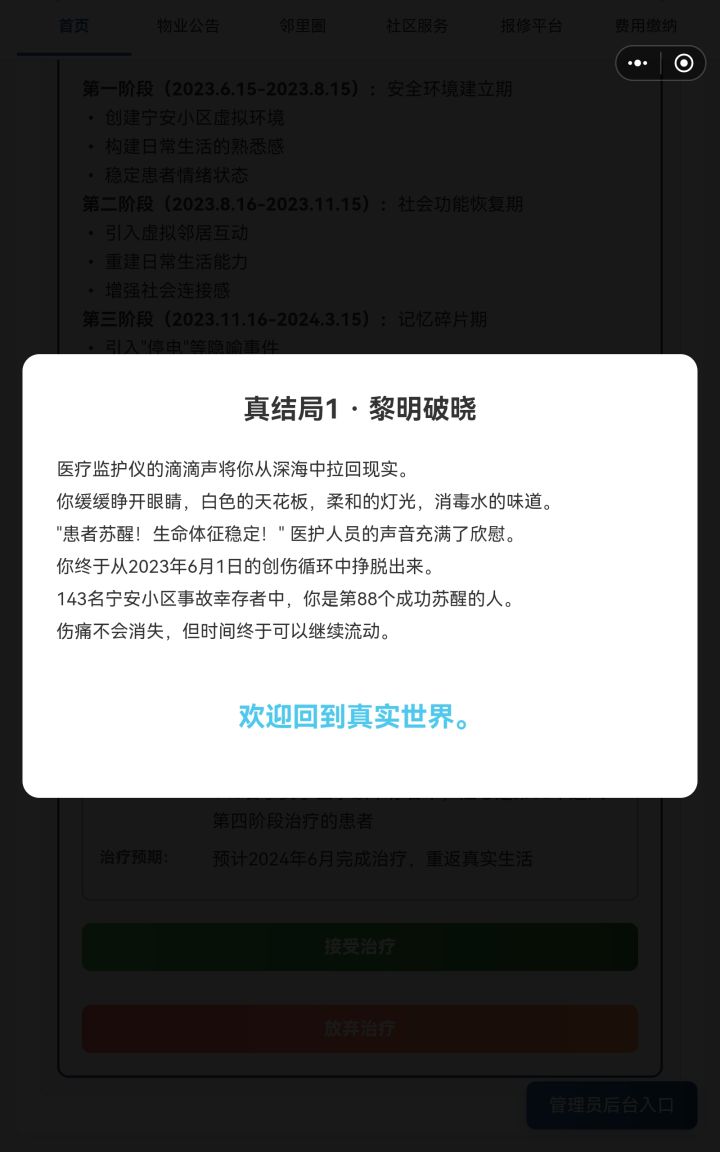 通关感想:第一次玩这类型游戏,玩的时候一脸懵逼,最后还是看攻略通关了真结局,但看着攻略答案跟着输入,又感觉缺少了些许探索感,所以才写出这篇攻略,来给难以上手的玩家一些通关游戏体验(感觉像规则怪谈了)。一级提示:(适合无头苍蝇玩家)1.通关时间很短2.搜索栏有用,但不关键3.搜索信息不完整(1/6那个)也不影响结局4.社区活动很关键5.缴费提示很有用6.登录信息有用,但不用深入研究,浅
