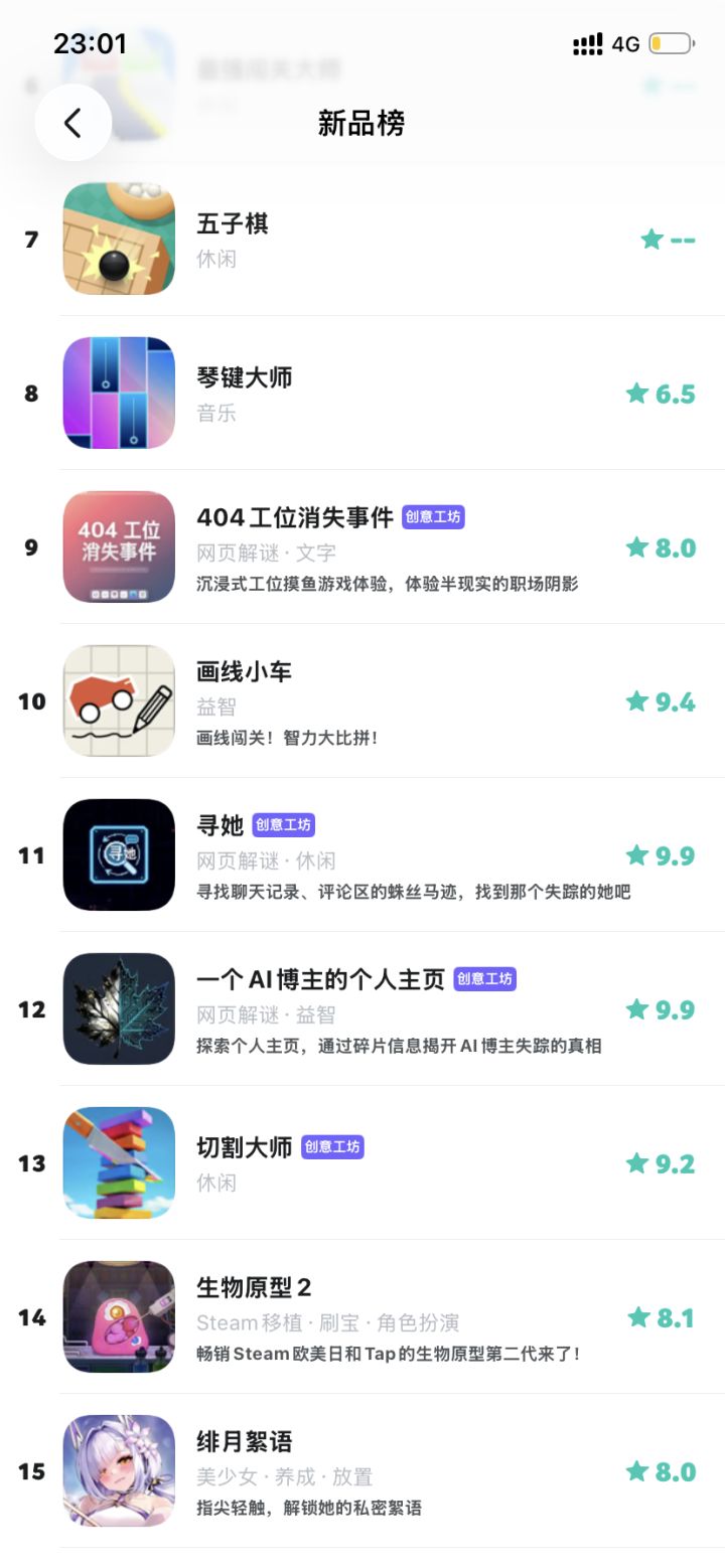 首先请允许作者小小的晒一下成绩单,在上线的第一周内,最高拿到了TapTap新品榜第12名作为一个首次尝试 + 只用了一个人一周时间完成从设计到上线的作品,作者的感受就是开心+满足,感谢每一位喜欢这个游戏、给了游戏和作者本人很多支持的各位老师们同时也多少会有些惶恐,因为深知游戏本身有很多不完美的地方,这一周内收到了很多老师的建议和反馈,作者