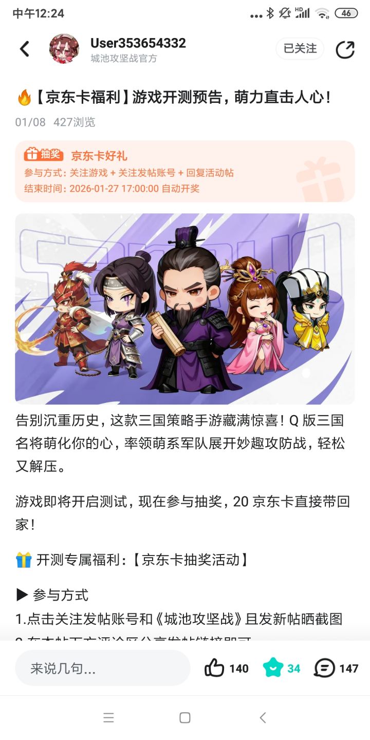 告别沉重历史,这款三国策略手游藏满惊喜!Q 版三国名将萌化你的心,率领萌系军队展开妙趣攻防战,轻松又解压。游戏即将开启测试,现在参与抽奖,20 京东卡直接带回家!🎁 开测专属福利:【京东卡抽奖活动】▶ 参与方式1.点击关注发帖账号和《城池攻坚战》且发新帖晒截图2.在本帖下方评论区分享发帖链接即可【奖品发放】到达开奖时间后,由taptap系统随机抽取符合要求的幸运玩家,自动发放兑换码(