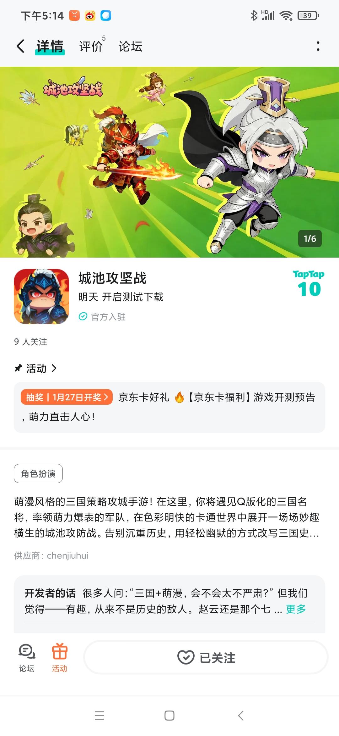 告别沉重历史,这款三国策略手游藏满惊喜!Q 版三国名将萌化你的心,率领萌系军队展开妙趣攻防战,轻松又解压。游戏即将开启测试,现在参与抽奖,20 京东卡直接带回家!🎁 开测专属福利:【京东卡抽奖活动】▶ 参与方式1.点击关注发帖账号和《城池攻坚战》且发新帖晒截图2.在本帖下方评论区分享发帖链接即可【奖品发放】到达开奖时间后,由taptap系统随机抽取符合要求的幸运玩家,自动发放兑换码(