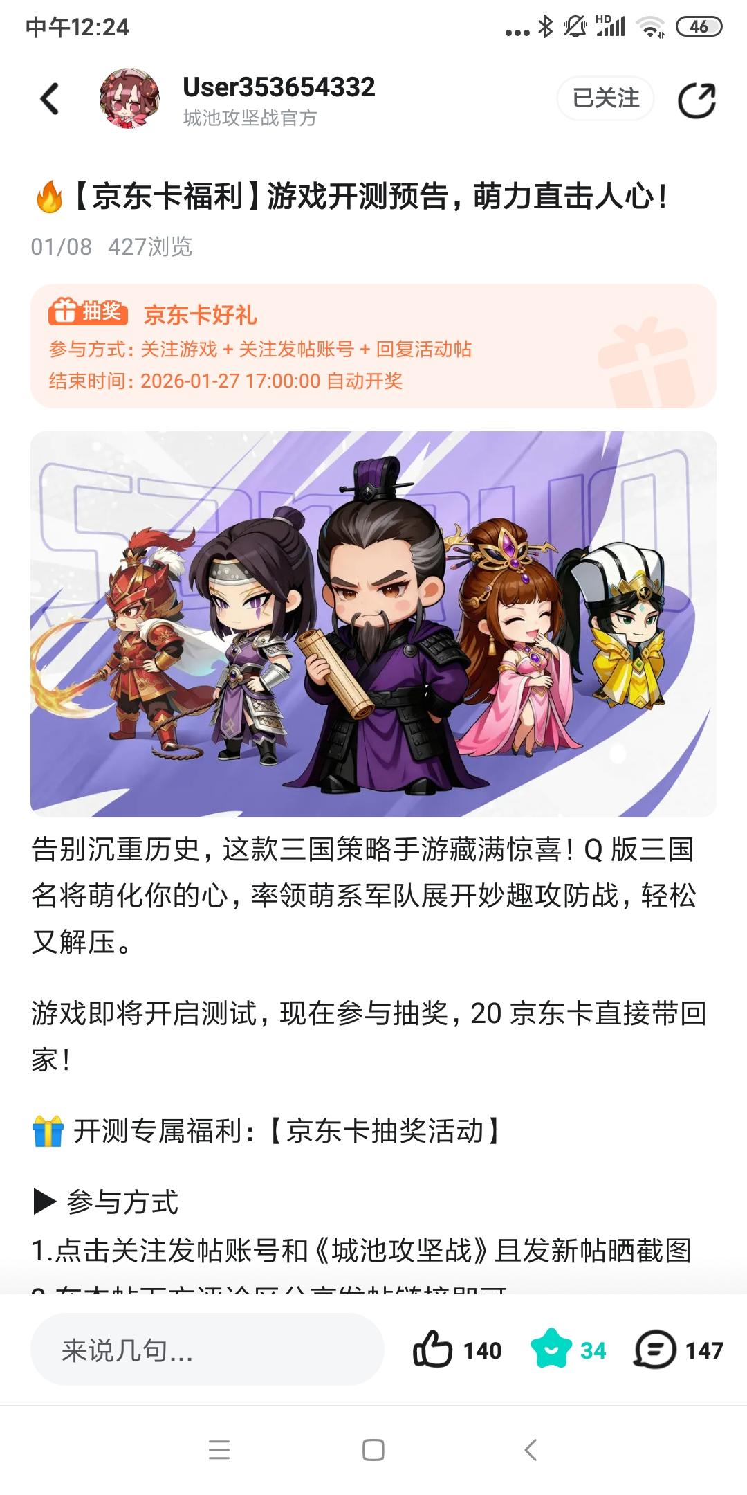 ✨ 萌力爆表的三国世界来送福利啦!✨还在等什么?这款让你会心一笑的萌漫风格三国策略攻城手游,现已开启抽奖活动!现在参与抽奖,就有机会获得专属礼包码,助力你轻松开启妙趣横生的攻城之旅!礼包内容:高级宝物自选包*4📌参与方式: 活动期间玩家需要在本帖评论区中留下您的游戏ID截图以及区服,即可自动参与抽奖,无需额外步骤。🎯【活动内容】1:我将随机抽出20位大大获得专属礼包*1;2:参与人数大