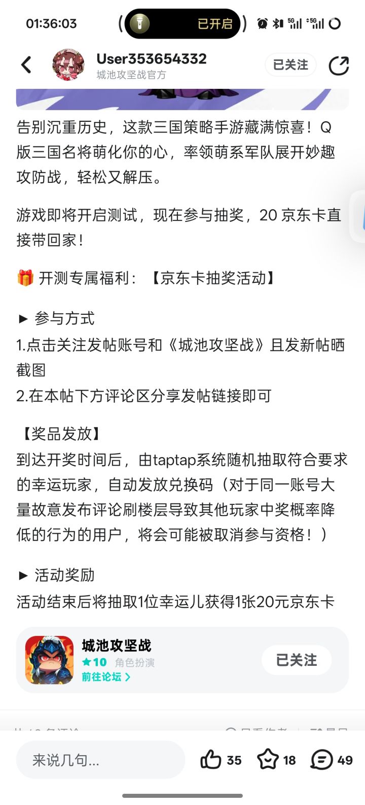告别沉重历史,这款三国策略手游藏满惊喜!Q 版三国名将萌化你的心,率领萌系军队展开妙趣攻防战,轻松又解压。游戏即将开启测试,现在参与抽奖,20 京东卡直接带回家!🎁 开测专属福利:【京东卡抽奖活动】▶ 参与方式1.点击关注发帖账号和《城池攻坚战》且发新帖晒截图2.在本帖下方评论区分享发帖链接即可【奖品发放】到达开奖时间后,由taptap系统随机抽取符合要求的幸运玩家,自动发放兑换码(