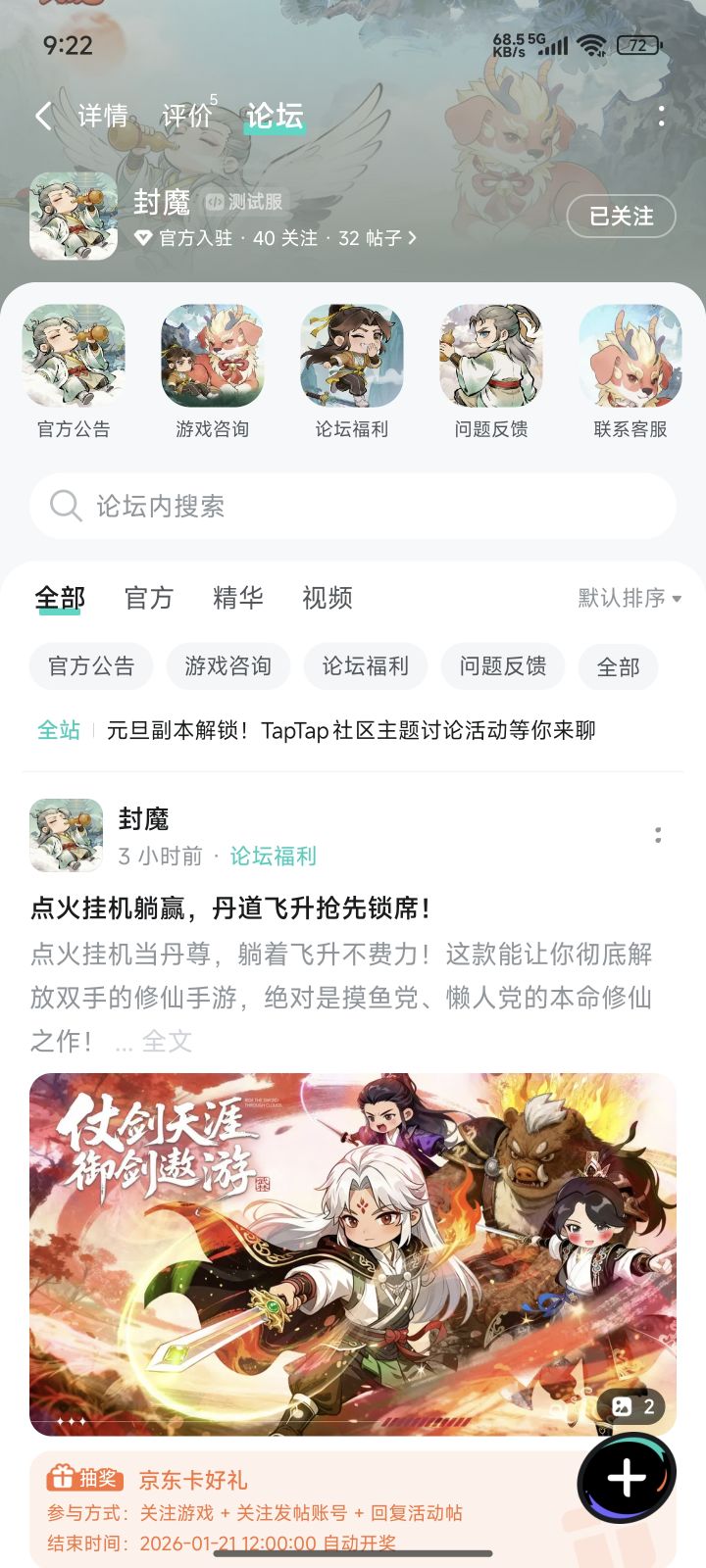 点火挂机当丹尊,躺着飞升不费力!这款能让你彻底解放双手的修仙手游,绝对是摸鱼党、懒人党的本命修仙之作!即刻关注锁席,坐等开测飞升!邀仙友共盼丹道大宗开启,将抽5人送20元京东卡!▶ 参与方式1.点击关注发帖账号并关注《封魔》且发新帖晒截图2.在本帖下方评论区分享发帖链接即可【奖品发放】到达开奖时间后,由taptap系统随机抽取符合要求的幸运玩家,自动发放兑换码(对于同一账号大量故意发布
