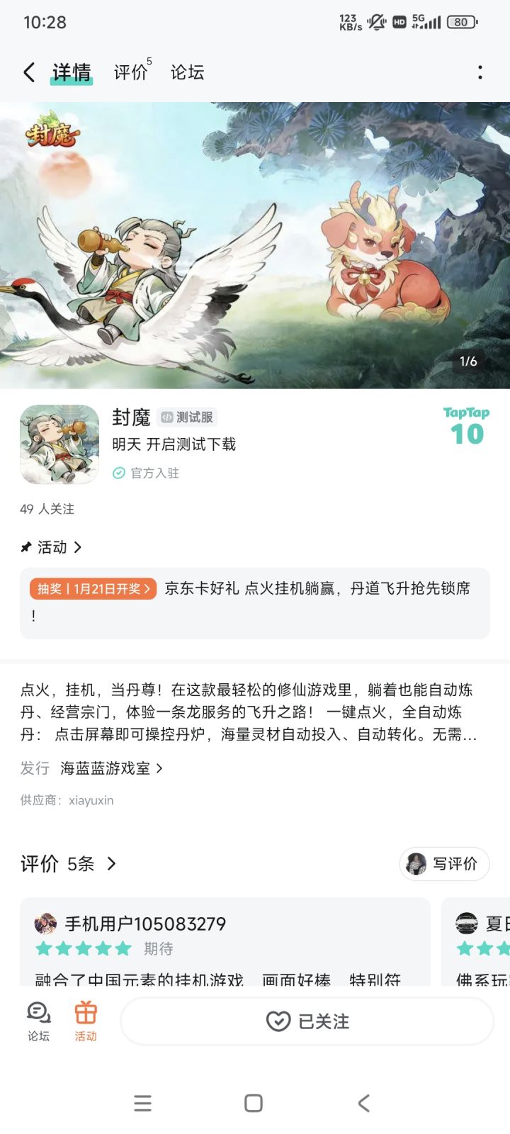 点火挂机当丹尊,躺着飞升不费力!这款能让你彻底解放双手的修仙手游,绝对是摸鱼党、懒人党的本命修仙之作!即刻关注锁席,坐等开测飞升!邀仙友共盼丹道大宗开启,将抽5人送20元京东卡!▶ 参与方式1.点击关注发帖账号并关注《封魔》且发新帖晒截图2.在本帖下方评论区分享发帖链接即可【奖品发放】到达开奖时间后,由taptap系统随机抽取符合要求的幸运玩家,自动发放兑换码(对于同一账号大量故意发布