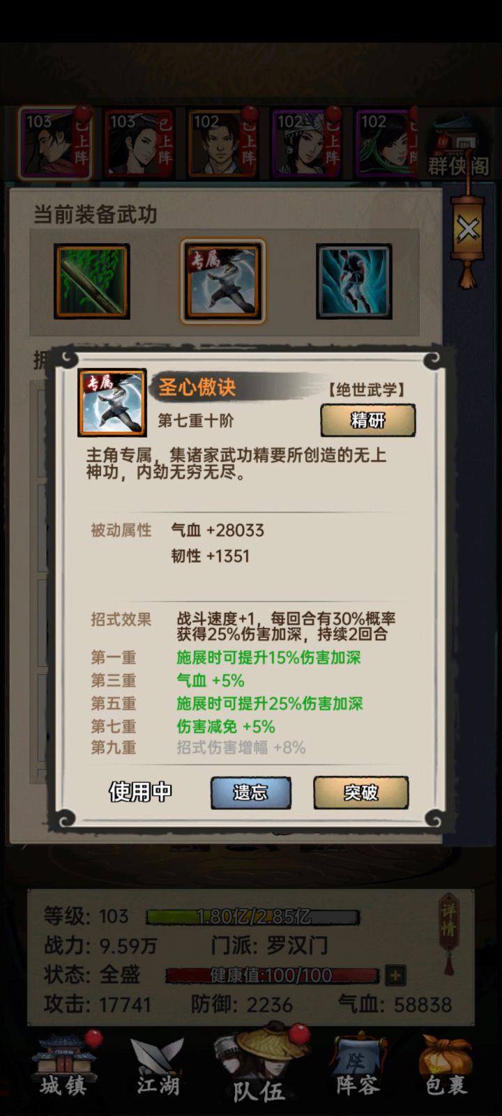 特意修改加了条最新建议(评论最后建议3),顺便发下我的最新游戏进度,下图可见。按目前这个趋势,才刷30层就出了第一本绝学,那么推论后续更新应该还会出神话武学,建议后续版本出的神话武学的被动可以稍稍复杂一点,让游戏多一点策略性,让我们玩家在组队阵容搭配与武学搭配上有更多的可能性,更有趣好玩一些,而不是搞数值怪,千篇一律的武侠阵容那一套,后者注定走不远!