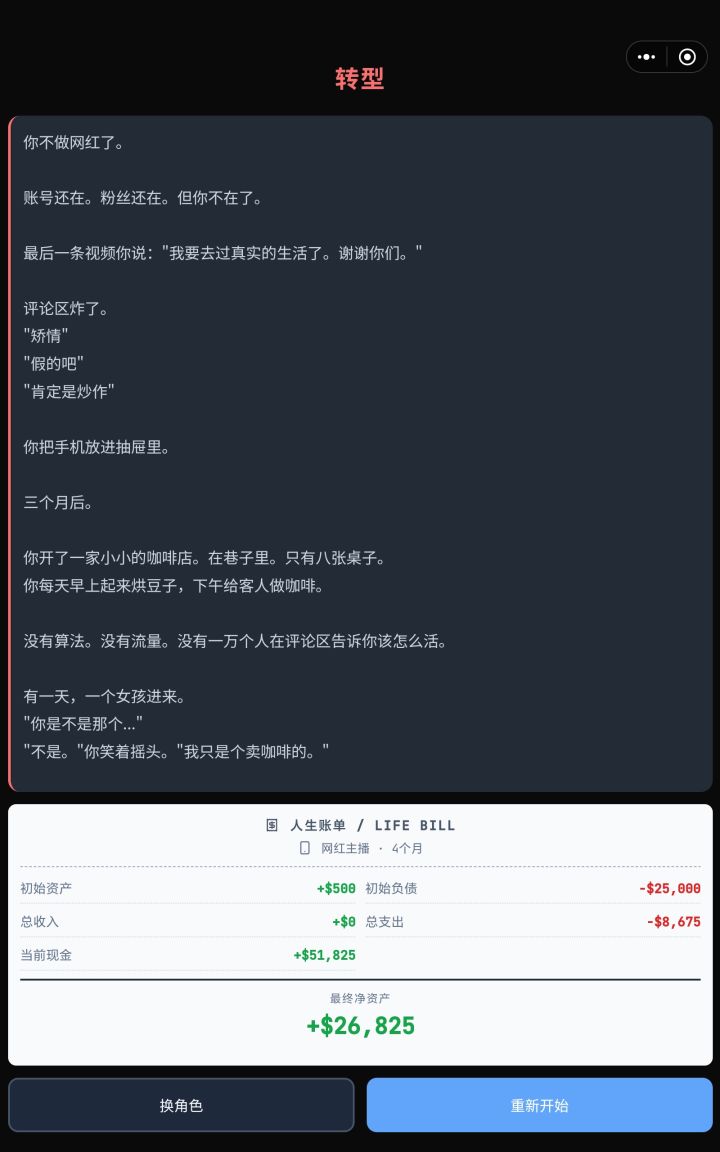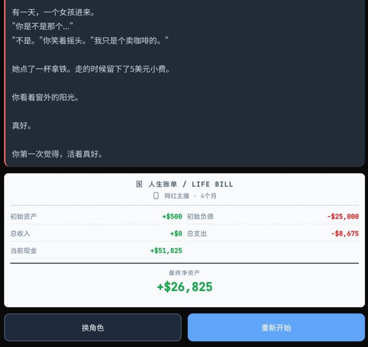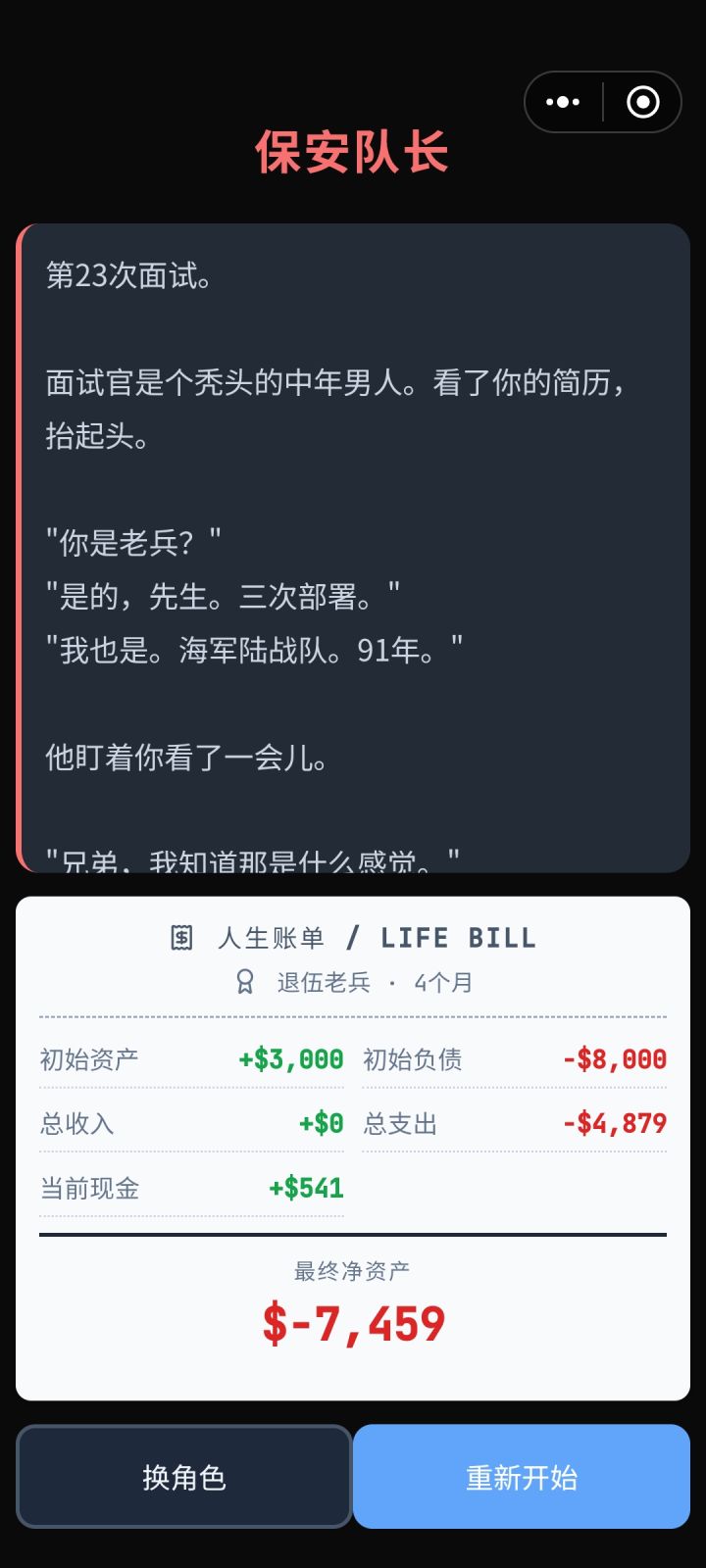 游戏选择了六类牢美典型困难群体作为初始角色。玩法为文字描述和选选项,选择有一定技巧但大部分靠运气,好选项概率很小。