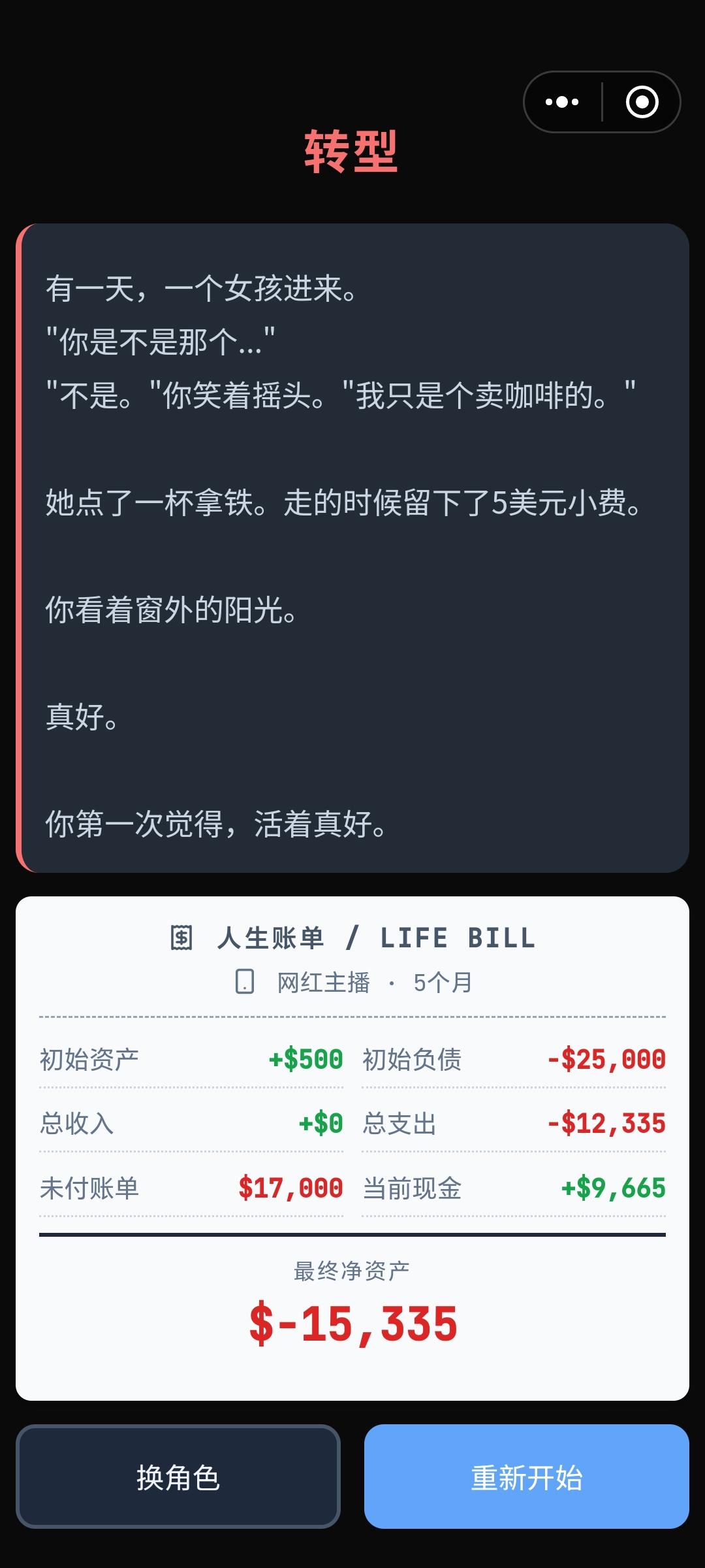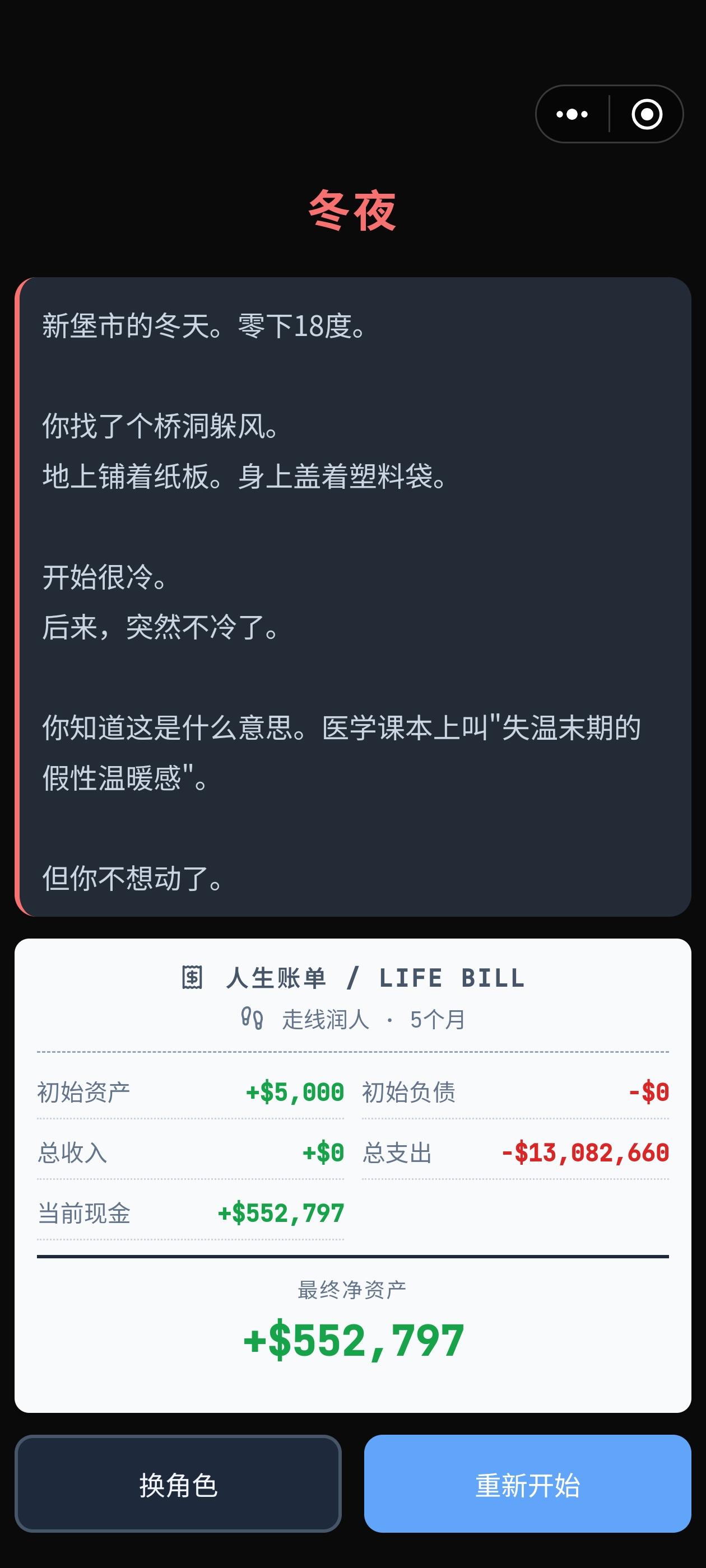 选择界面加个成就系统就更好了,可以的话再加个主页面,游戏做成这样已经很好了,可以把界面弄成好几种自选风格,简约,朋克,复古,继续做前景还是有的,再多些结局路线,后续可以加入出国元素,阶级进化,解锁更好开局,可以用ai帮忙,现在这个游戏进去纯受虐,而且点几下就结局,节奏太快了,放缓,快节奏可以修改一下数值做成挑战模式。