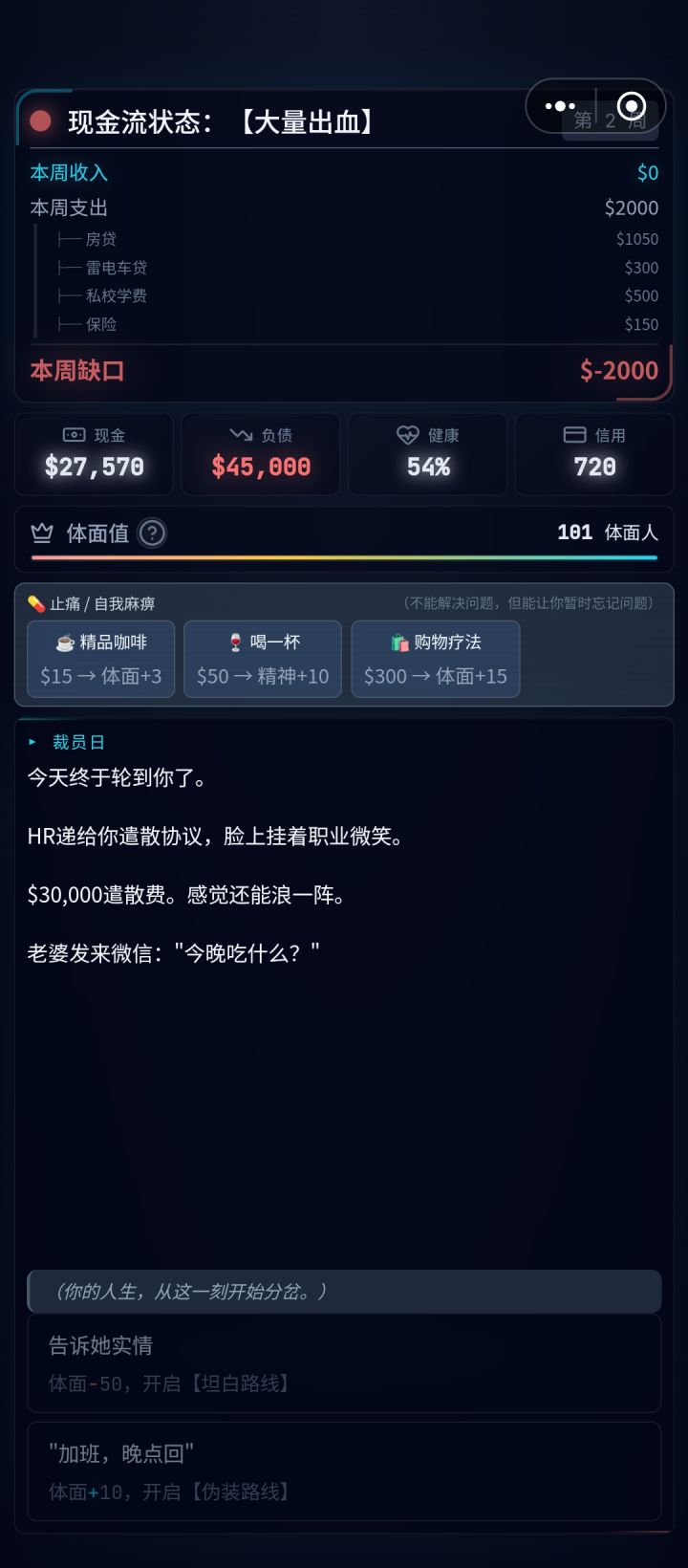简单玩了一下,剧情可玩性很短,但是估计作者工作量很大,因为要不停的设计剧情来延长,但事实上这无济于事,这游戏不适合这样发展。——————————建议——1,画面布局有点乱,最好重新设计一下。——2,文字剧情改为随机性岀现,但不再作为主线,游戏为今天和下一天,今天可以工作或娱乐什么的,工作分为风险性工作和无风险性工作,(风险和金钱多少挂勾。)——(娱乐触发随机事件和认识新npc,比如