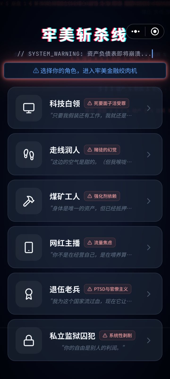 简单玩了一下,剧情可玩性很短,但是估计作者工作量很大,因为要不停的设计剧情来延长,但事实上这无济于事,这游戏不适合这样发展。——————————建议——1,画面布局有点乱,最好重新设计一下。——2,文字剧情改为随机性岀现,但不再作为主线,游戏为今天和下一天,今天可以工作或娱乐什么的,工作分为风险性工作和无风险性工作,(风险和金钱多少挂勾。)——(娱乐触发随机事件和认识新npc,比如