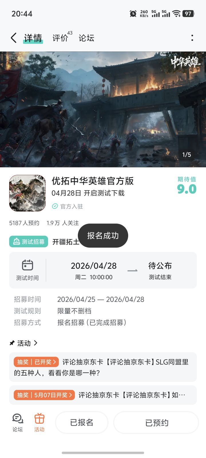 各位主公好:《中华英雄》「开疆拓土」限量测试招募开启!上一次测试后,感谢大家对我们的支持,大家的问题与建议我们都已收到,也做了调整。现在带着大家期待优化后的《中华英雄》重新回归测试。>>>点击即可参与测试招募参与晒图活动即可抽取京东卡好礼!【参与方式】1.关注《中华英雄》且发新帖晒游戏内截图(自带水印)2.在本帖下方评论区分享发帖链接即可【活动时间】即日起~2026年5月2日2