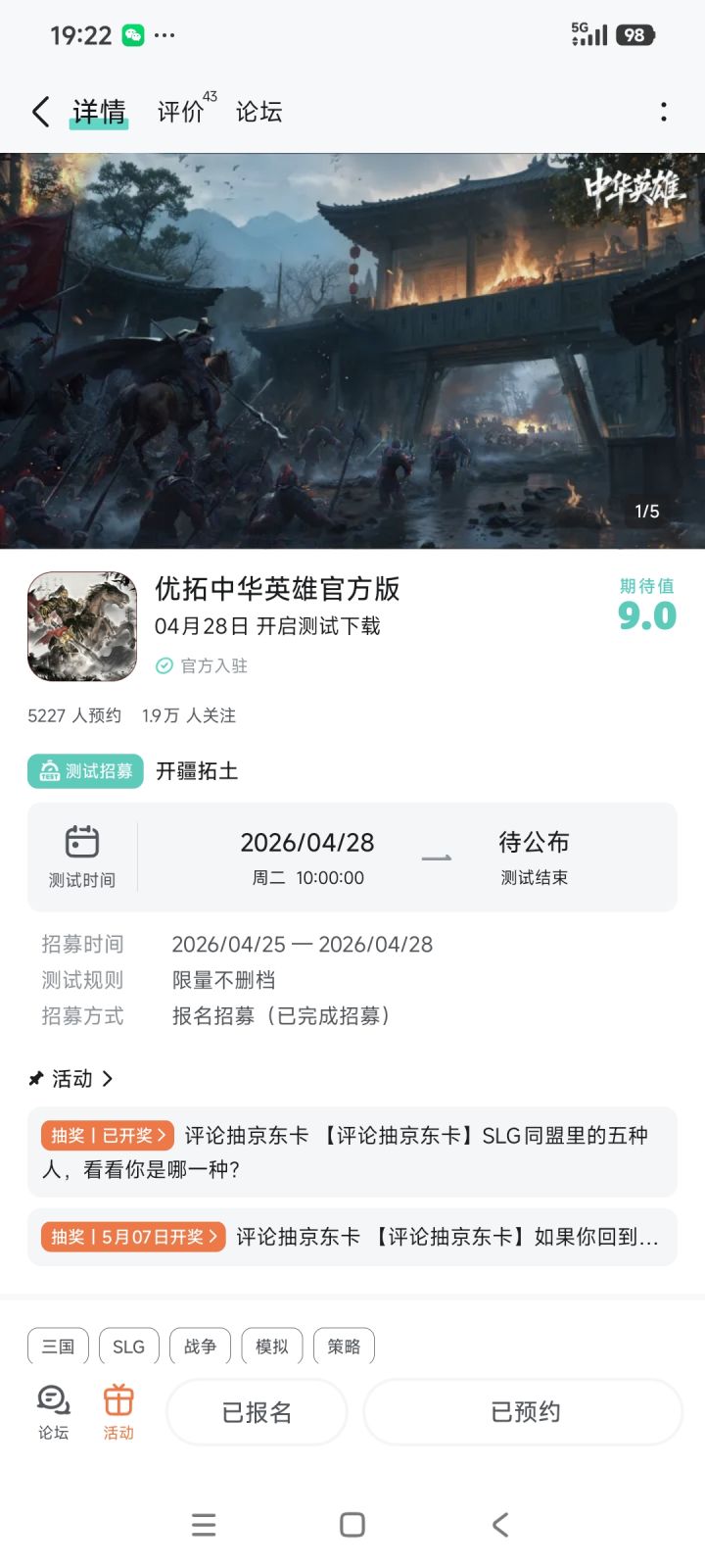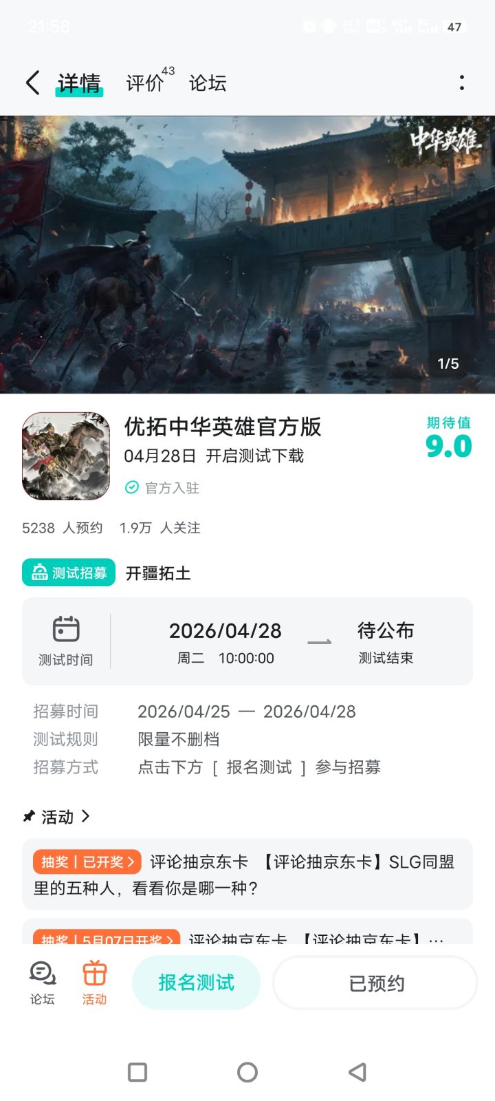 各位主公好:《中华英雄》「开疆拓土」限量测试招募开启!上一次测试后,感谢大家对我们的支持,大家的问题与建议我们都已收到,也做了调整。现在带着大家期待优化后的《中华英雄》重新回归测试。>>>点击即可参与测试招募参与晒图活动即可抽取京东卡好礼!【参与方式】1.关注《中华英雄》且发新帖晒游戏内截图(自带水印)2.在本帖下方评论区分享发帖链接即可【活动时间】即日起~2026年5月2日2