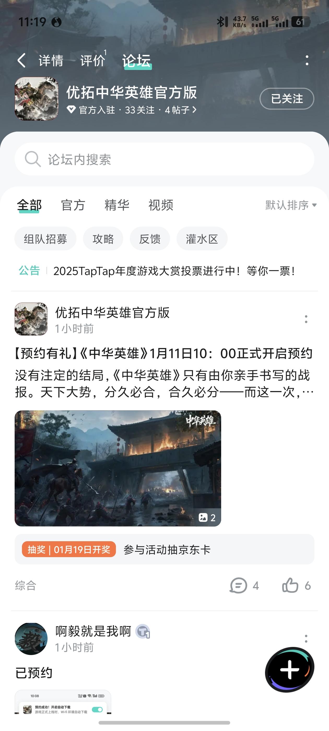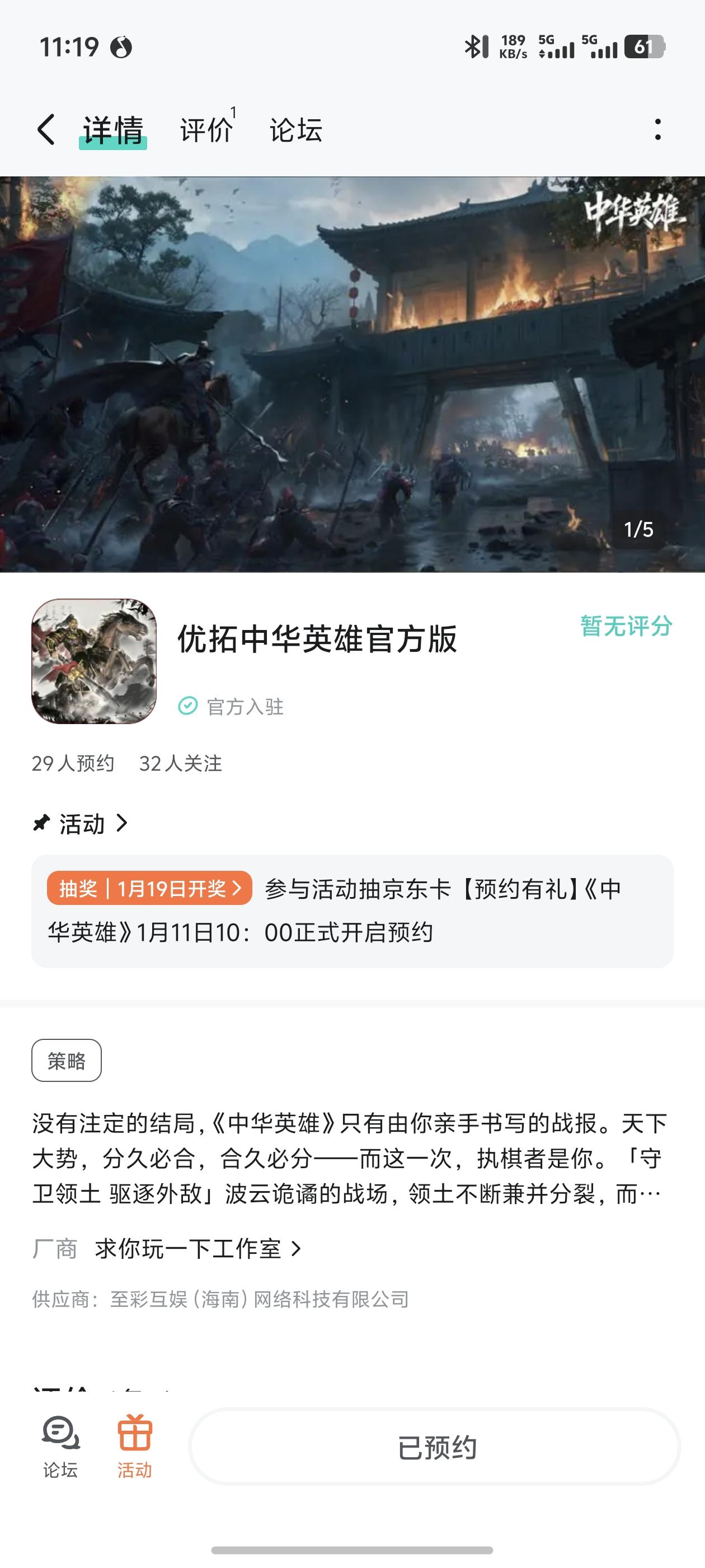 没有注定的结局,《中华英雄》只有由你亲手书写的战报。天下大势,分久必合,合久必分——而这一次,执棋者是你。>>>点击即可预约【参与方式】1.关注《中华英雄》且发新帖晒截图2.在本帖下方评论区分享发帖链接即可【活动时间】即日起~2026年1月19日 23:59【活动奖励】京东卡,共10份【注意事项】1.仅有符合活动要求的评论会被视为有效参与活动,若回复内容未能满足活动要求,则被视