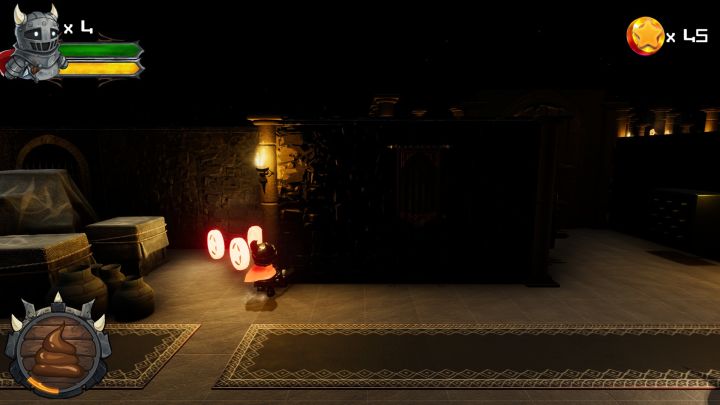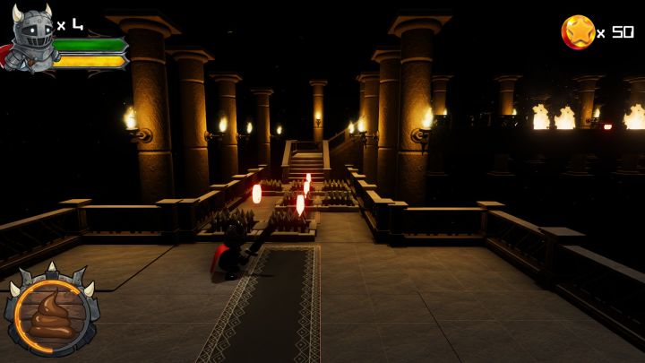 回到玩法本身。《Potty Knight Saga》在玩法设计上倒反而没有太多可圈可点的特色了,只能说是中规中矩。玩家扮演的窜稀骑士在冒险中需要闯过很多机关陷阱,并同时收集路途上的金币,确实有点马里奥的感觉,只不过本作是以横版为主、同时也有前后纵深移动的3D场景,比马里奥那种纯粹横版2D的场景在空间上还是要更丰富一点。