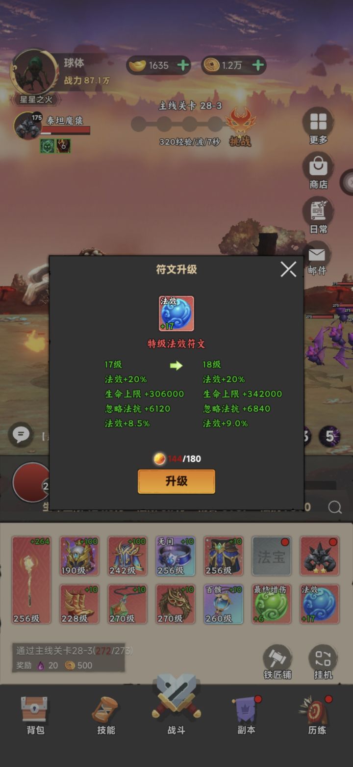 1.月卡,终身卡 游戏等级是最重要的,月卡加终身卡可以加60%的经验获取,开局必买。2,符文 人物和宠物各能装备2个符文,符文是增加百分比属性,最高20级,而且没有等级限制,优先拉满。3,强化等级 强化等级是跟随人物等级提升,能增加装备主属性,换装备自动增加,必须拉满。4,法宝 法宝都是百分比属性,只能佩戴一个,但是属性是叠加的,最高20级,推荐拉满。5,宠物 宠物满星为9星,能