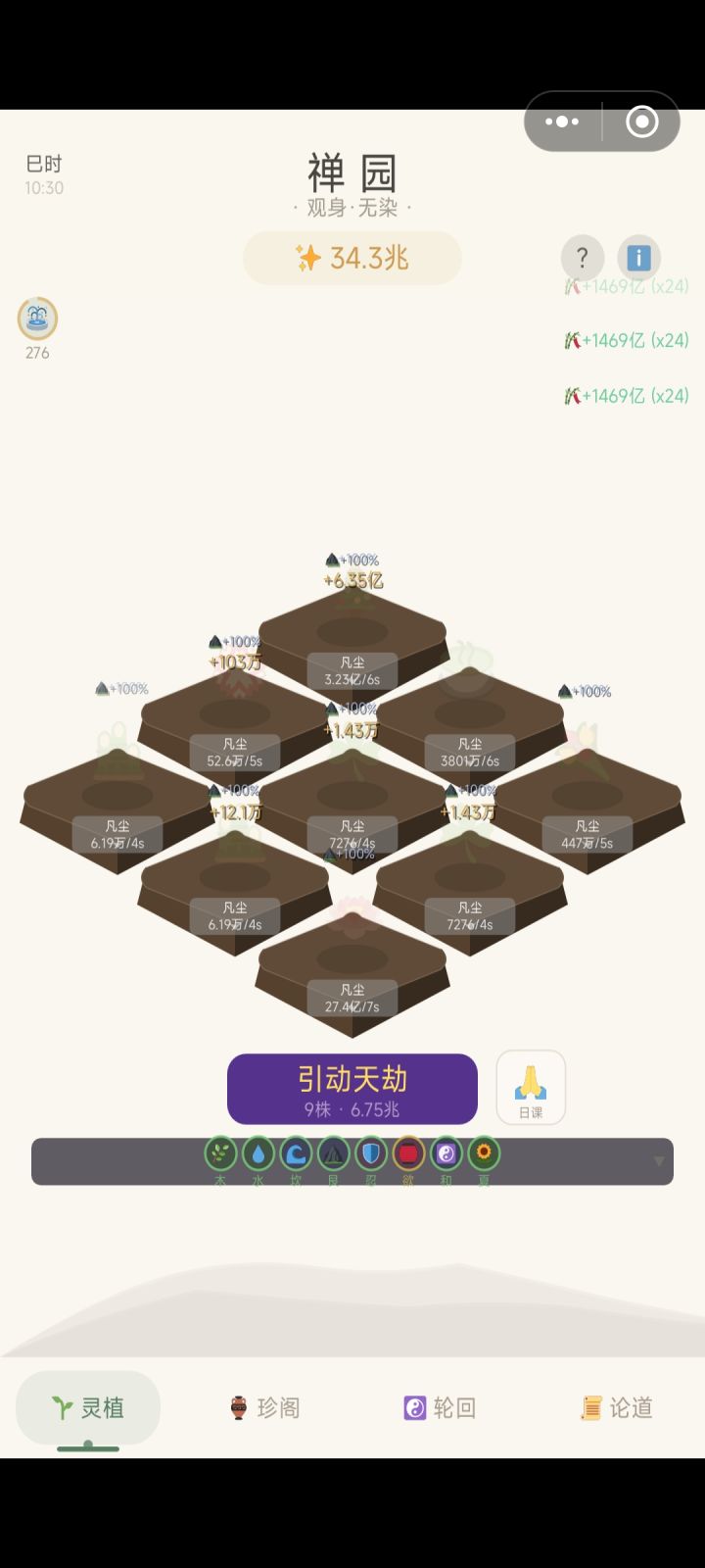 游戏当中的核心玩法上手难度非常低,在最初不断点击就好了,当钱够解锁下一个种子,就重新种植,有余钱就升级禅器,最后提升境界,后面就是不断重复上面的过程。