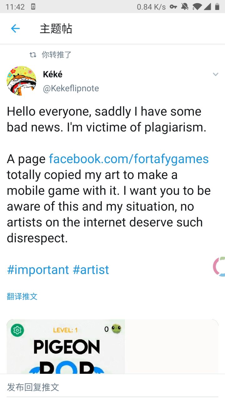 美术素材涉嫌严重的抄袭行为,游戏中包括那只魔性的鸽子在内的诸多创意,都是从画师 @Kekeflipnote 的劳动成果中剽窃来的。开发商 Fortafy Games 使用这些素材的时候既没有获得画师的许可,也没有向画师支付稿酬,反而在游戏中接入谷歌广告,让自己赚得盆满钵满。原创不易,请大家支持原创,抵制抄袭。谢谢大家。