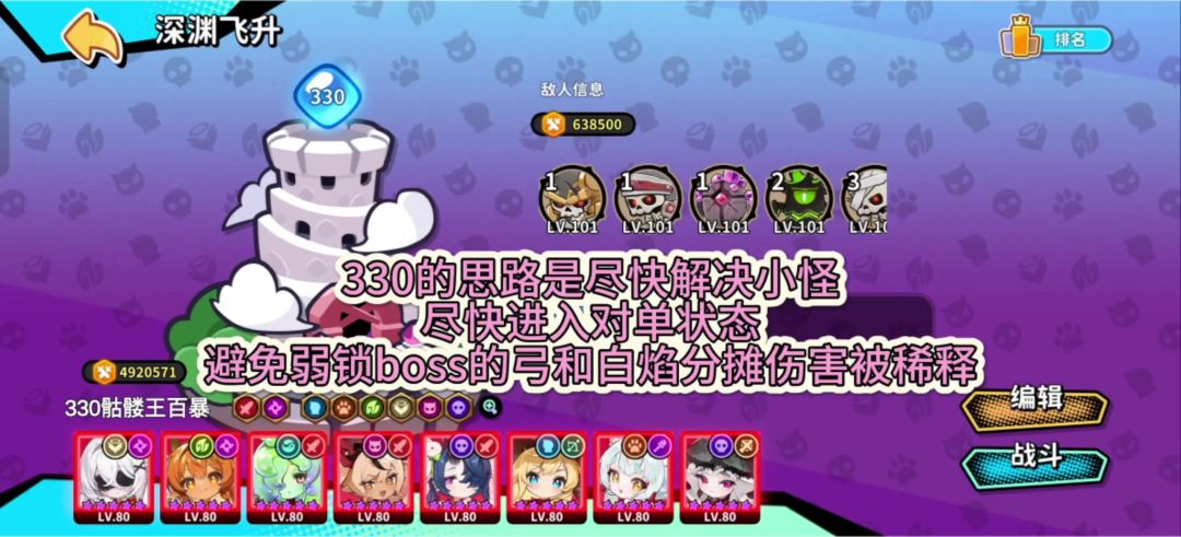 深渊从320开始考验对单和对群的综合能力,330的难度是更上一层楼,因此不仅要求有足够的输出伤害击杀boss,更要求尽快击杀小怪以尽快进入对单状态。 因此,将打桩队改造: 加入史莱姆(对单对群都是王)。 加入罗尼亚(斩杀小怪)。 加入克莱亚(沉默的buff很好用,避免被技能击退)。 对单角色的选择上: 天刺提供挂单百暴buff。 瑞林提供将boss拉动至最前方方便锁定。 罗薇娜提供减抗。 天赋选择