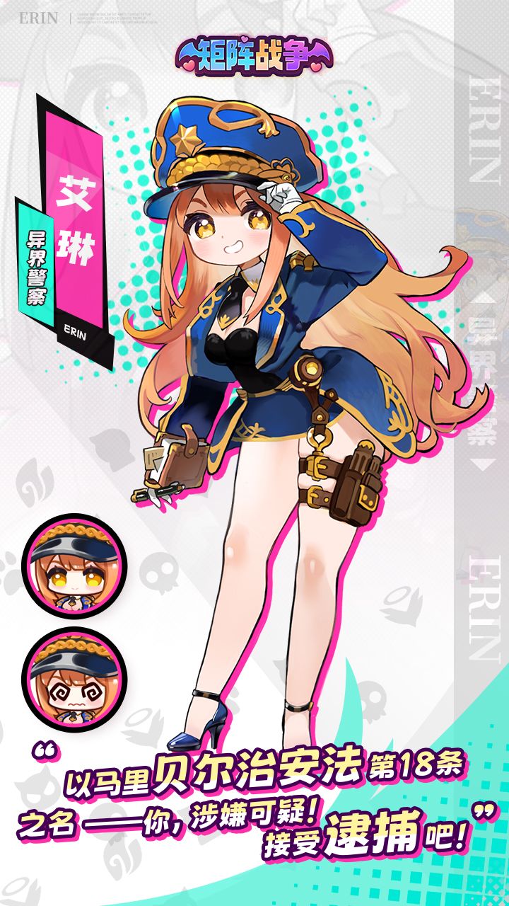 “我以为我已经死了,但你们让我重新感受到心跳的意义。现在,轮到我来守护你们了。”✦艾琳✦异界警察✦种族:人类✦职业:骑士艾琳曾是马里贝尔城的正牌治安官。自称“正义的执法者”,她多次无故逮捕市民、误炸民宅、追击猫咪——让整座城市的人都提心吊胆。她的“正义”没有界限,只有冲劲。即使搞错对象,她也理直气壮:“我没问题,是这城市病了!”最终因“重大执法不当”被免职。但她并未气馁,反而宣称:“这座