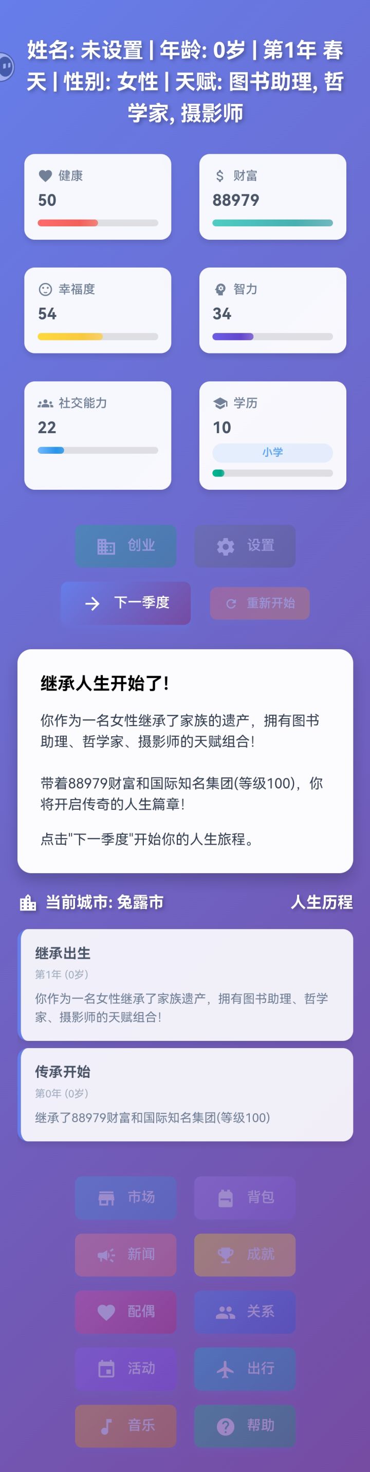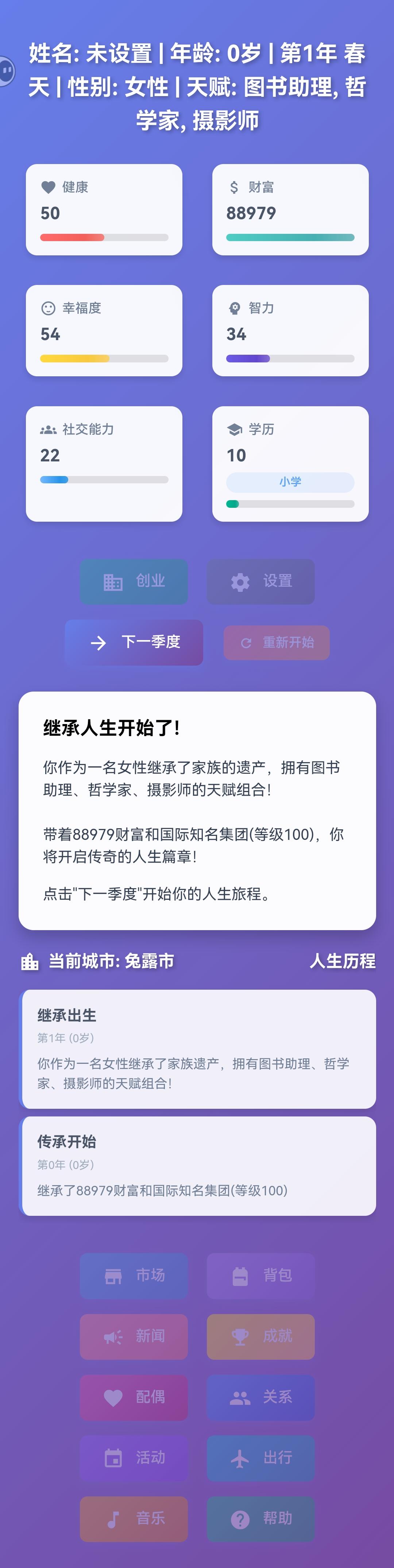 十分抱歉,游戏确实有很多不足点,职业是随机的,玩家学历属性越高,工资越高,学历属性每个季度会根据当前的智力属性增长,社交属性影响与父母索要财富的数量