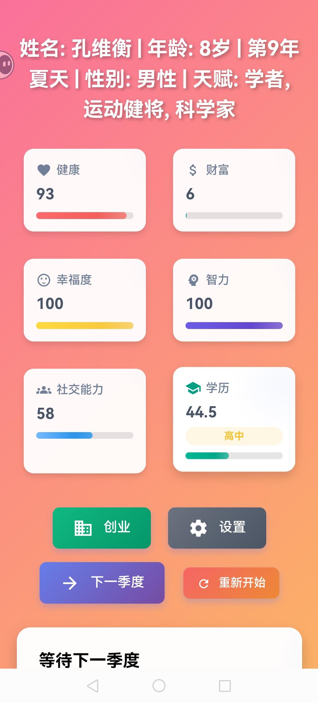 半成品 基本没啥玩的 毛病也和其他评论说的一样 按键失灵(下季度点不了) 学历没用 能点的按键很少(不知道是没做出来还是失灵) 毕竟是模拟性质的游戏 还是希望能加点随机事件 千篇一律就太无聊了