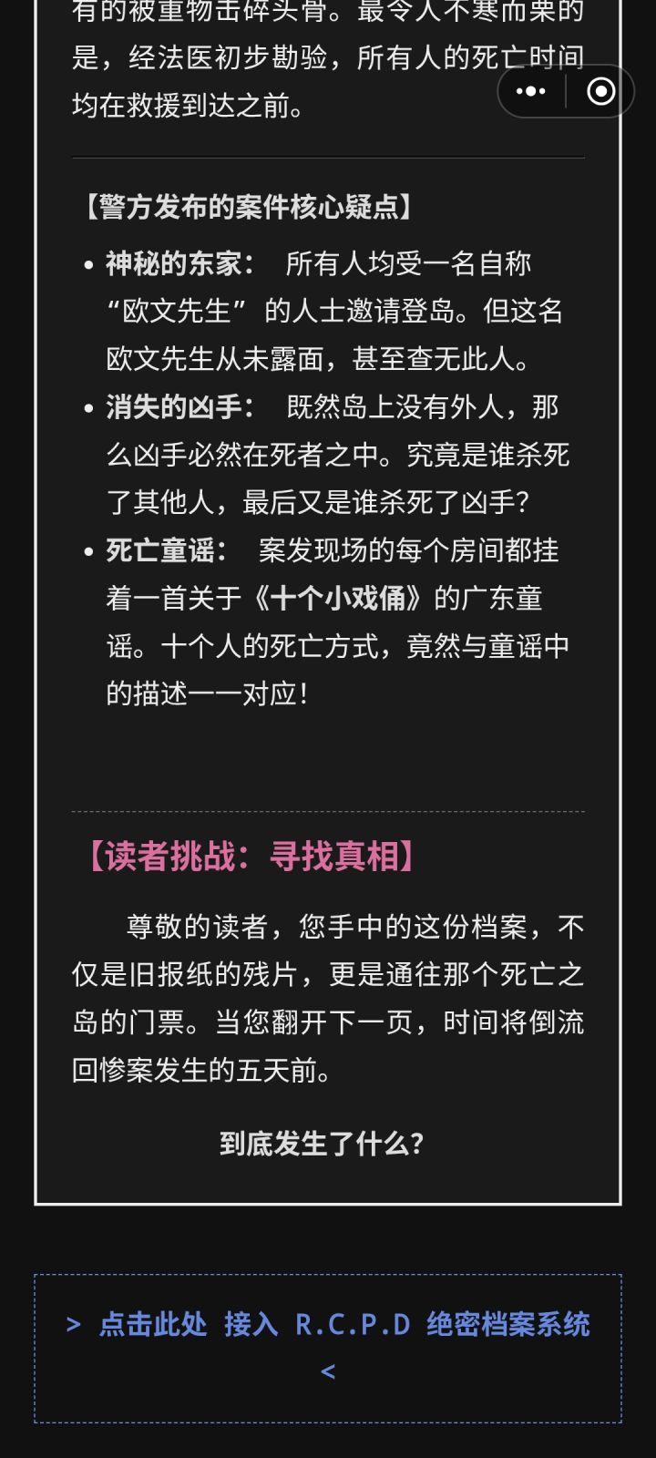 休闲游戏合集中的一款文字推理游戏,以竖屏网页的形式表现,文本内容非常多。进入终端后调查开始,有音频和证词等多种案件信息,以文本的形式来表达音频记录,画面全部靠脑补来完成。没有任何基础操作介绍,点击四个模块可以分别查看里面的信息,不用非得输入查看,操作易用性还不错。