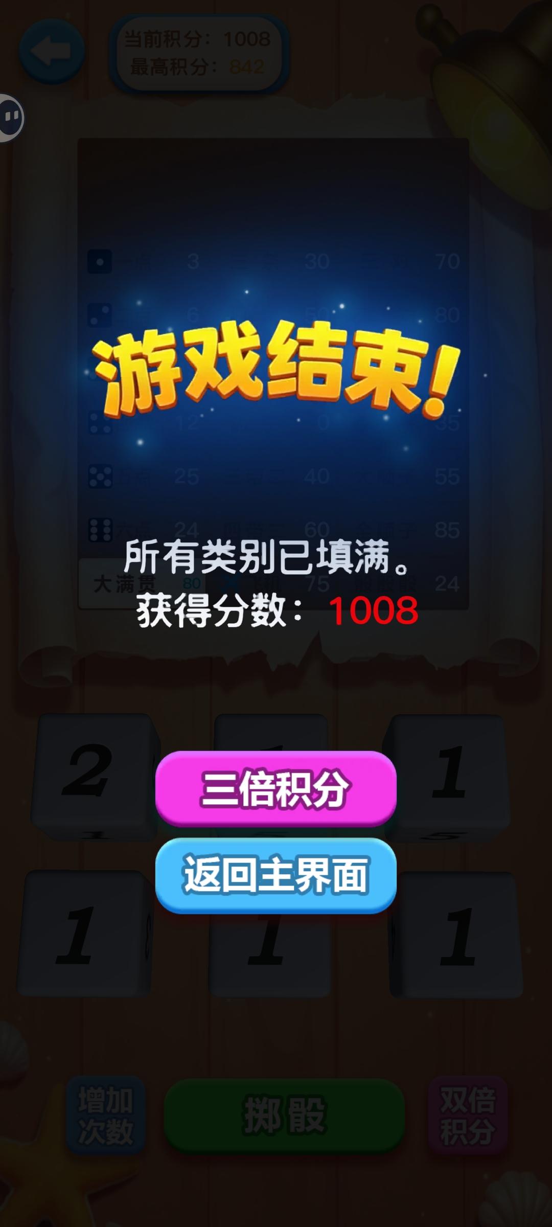 还不错,挺看运气的,也有点策略。这把运气很好,分数破千了,就差个豹子搞不出来,别的牌型全了