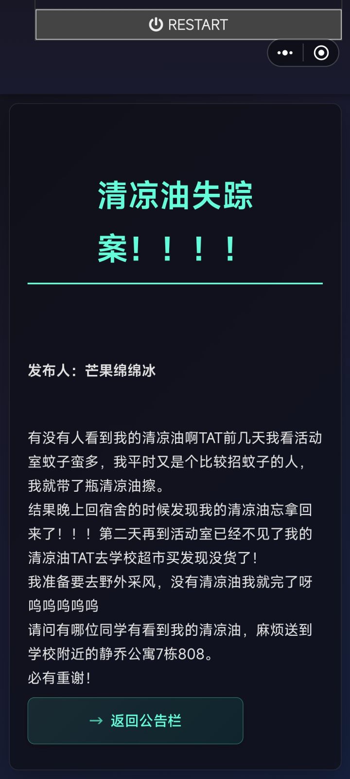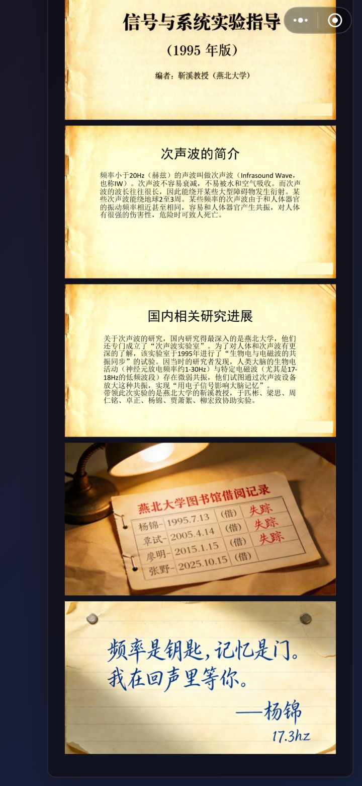 (最上方有一个右拉箭头,可以点击展开,整个页面能左右移动,最右上方,有左拉箭头,可以再关闭上半部分页面。可以save存档,后面阅读相关内容会解锁对应模块进行点击切换。内容多了后最上面中间位置有前进和后退按键)1、输入访问标识(可以随便用一个数字,方便输入,后面用不到了)查看归档文件(点击文件可以访问)①次声波实验记录1995.enc 密码提示IW②福康康事故调查报告.enc密码藏于回声