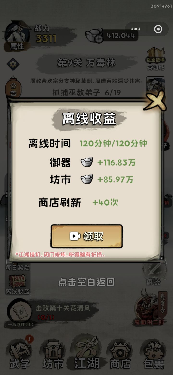 离线奖励只能广告领取,而且最多就俩小时,这广告我都懒得看。