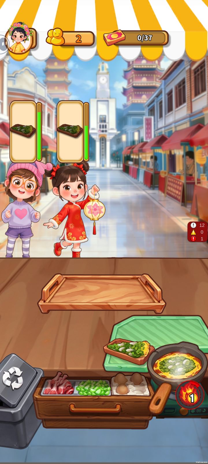 全是bug啊,一开始上不去菜,然后右边的那个感叹号不知道是什么,竖屏烹饪游戏目前没有平替市场很好的,好好弄一弄吧