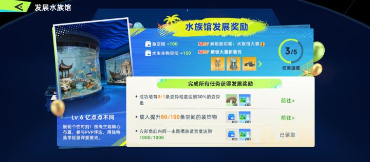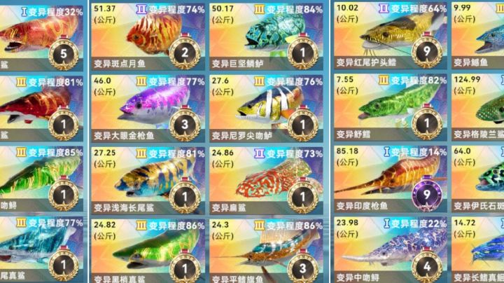 水族馆五级开启变异鱼培养,花费50蓝/紫/橙变异药+10条对应种类材料鱼合成。材料鱼星级越高/变异型越高,合成鱼变异值区间越高,在平均值上下波动10。变异鱼作为材料鱼只能放0/1条。0-39变异值为一型,40-74二型,75-100三型。材料鱼全6星变异均值40,二型+全10星均75,全11星均75,三型+全12星均90。同型变异鱼作为材料鱼加的变异值是一样的,一型20,二型31,三型43