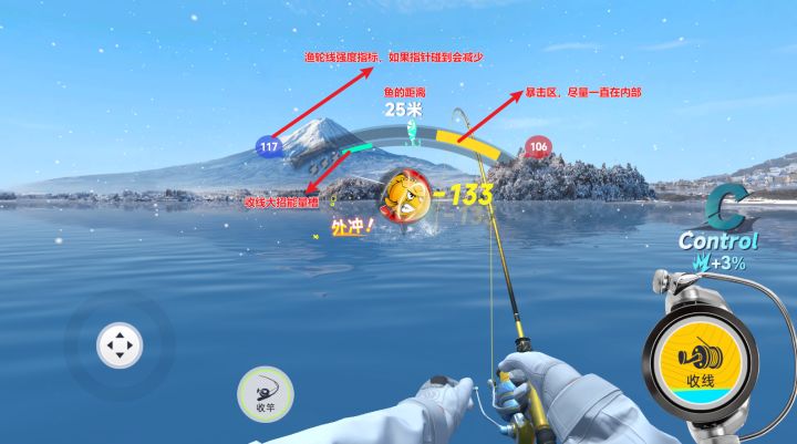 #游戏攻略 收线过程具有一定的操作技巧。一方面,需要尽量保持连竿,快速蓄满能量,获得收线大招。另一方面,应把握好收线大招的释放时机。前期可能会遇到鱼的距离频繁接近逃脱阈值,此时不宜吝啬收线大招。利用大招可将鱼拉回一定距离,玩家可借此机会再次蓄积大招,最终成功将鱼钓上岸。操作小tips:保持一定频率的点击,有助于更好地维持张力指针的稳定。不要遗漏双倍能量的连竿操作,这可以快速积攒收线大招能量