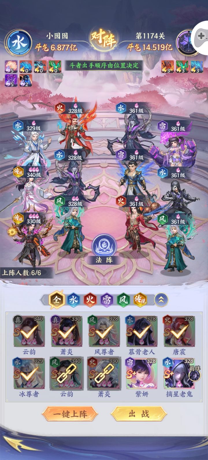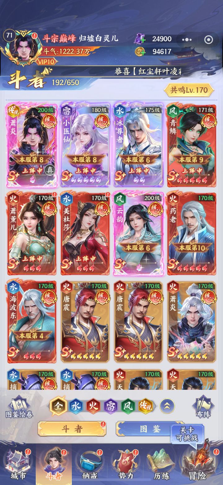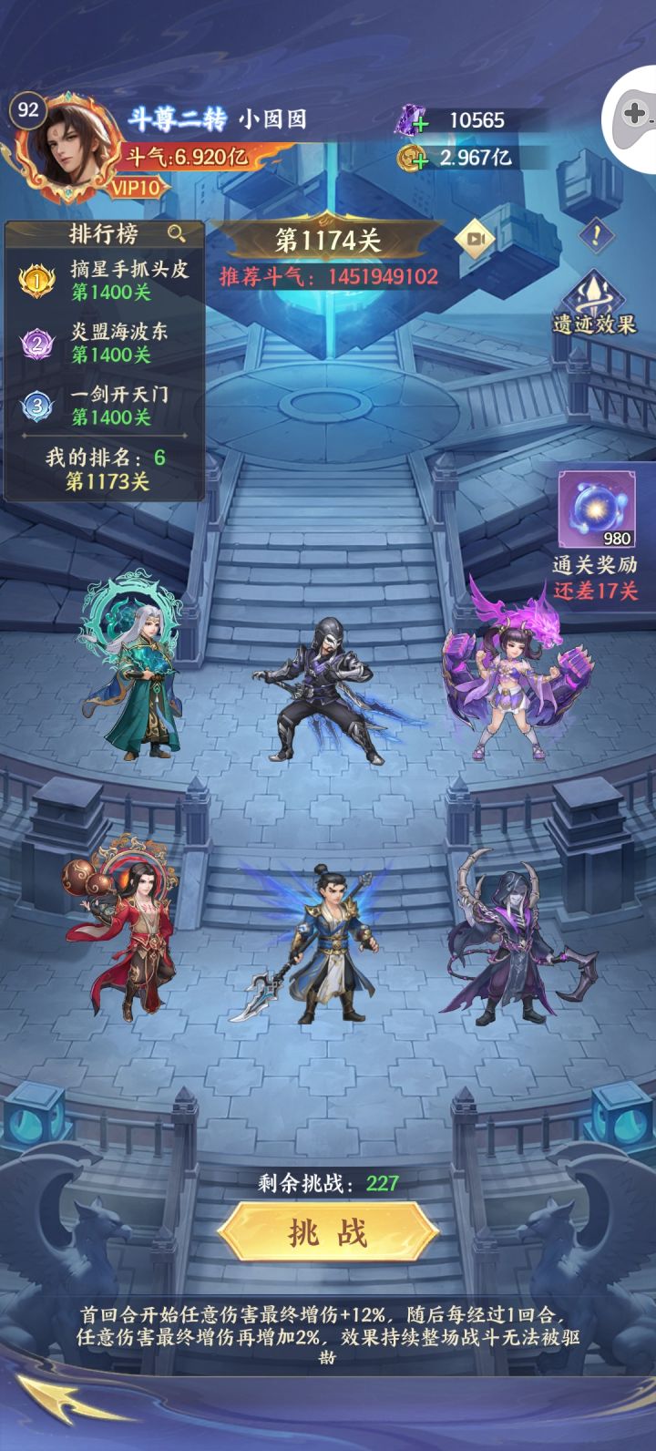 氪的都是满6减3的代金券,零碎买过一些6元礼包,所以没有什么零氪以上的道具。最近没什么时间玩,基本就是做做每日,没太研究,斗技配置什么的仅供参考,未必是最好的选择。今天做每日时试炼之塔打得挺顺,索性就试试能不能通,直接打了200多关,除了红莲业火的关卡把玄机铠换给萧炎外,没有任何调整,一路点下去也没太卡,所以这个配置通关应该不算吃力。