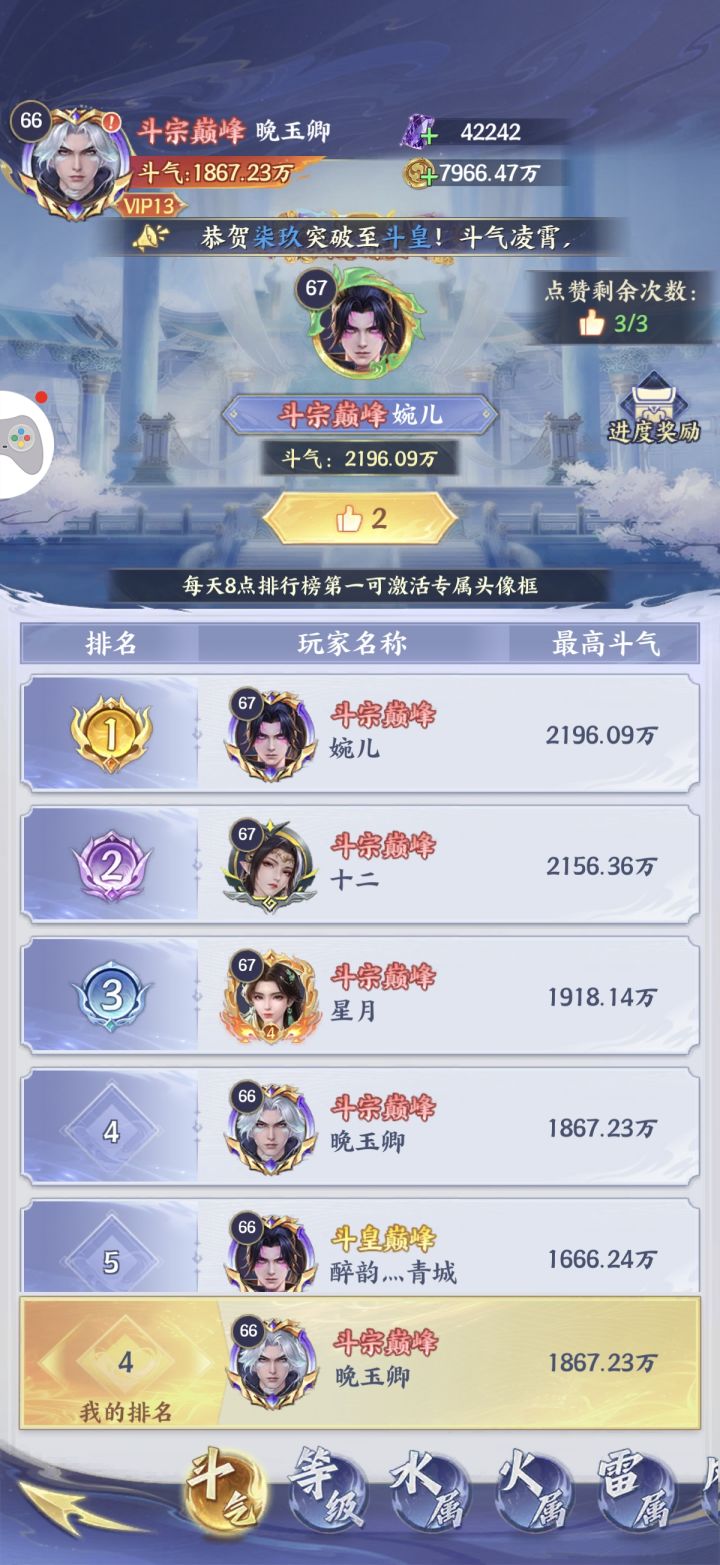 第八天1900万,斗宗了,哦我忘记跟你们说一件事情,商店还有一个要买的,就是斗技,紫色等你买满了再开始买橙色,零氪微课都一样,是非对错我已经无法分辨,传说消炎无限越战无敌,有什么不懂的可以问,血脉升星第一个需要一个本体,第二层需要两个本体,兄弟们注意,有什么不懂的告诉我,我来解答 来自TapTap[ID:82076886 也许]