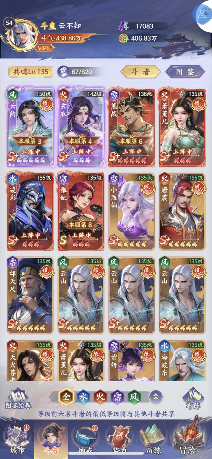 今天开服第7天,做个收关。我是开服第五天,600多抽才抽到第一张核心S+输出-云韵,所以前面没出很正常,等出第一张S+核心再定阵容。我这边是云韵主C+玄空子+古清阳+唐震+雅菲+冰尊者之前测试同为10星(红5),玄空子在有唐震灼烧的前提下只能打云韵伤害的一半,真是离谱!我玄空子出太多了就升起来链接传说消炎,雅菲等小医仙凑够本体当狗粮,唐震换紫研/青麟/玄衣或其他的辅助卡,看谁星高。看一下