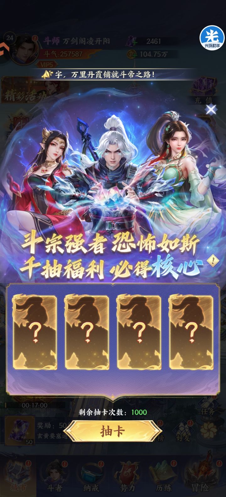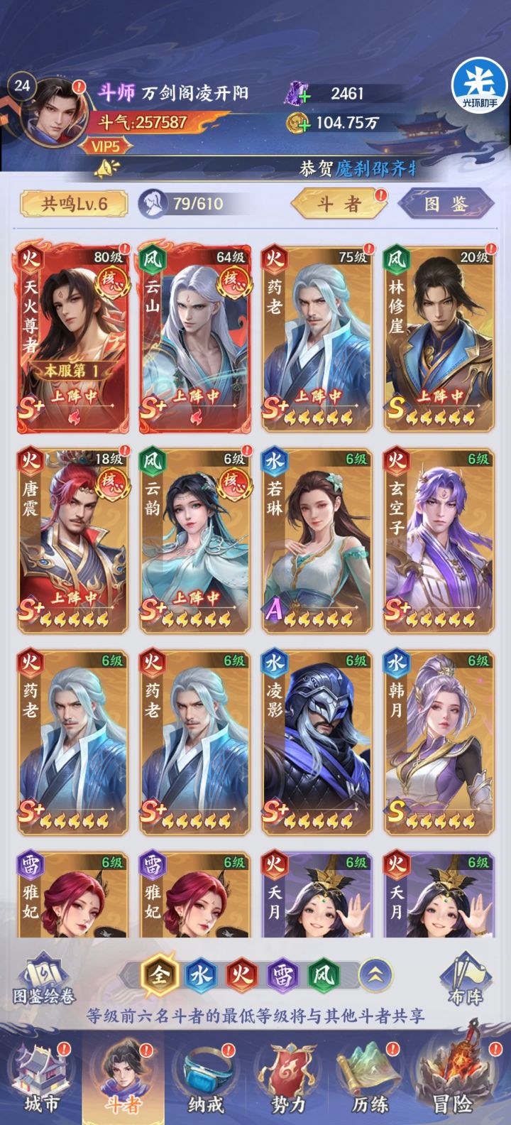 萧炎第四天就可以帝境了,之所以没升是考虑收益最大化,彩5可以吃到炎帝活动满奖励.升帝境的本体可以后边慢慢等抽到白嫖.其余4个小娘们全彩1是为了解锁天赋,目前萧炎站在5号位=======第一回合轮到他出手时可达16怒气.========至于这个熊战纯冲人数的,钻3正好后边给萧炎当狗粮升帝境.爬塔轻松越战接近一倍战力,毋庸置疑的简单粗暴目前PVP一拳超人,任何队伍即使同战力也是全屏秒杀,火