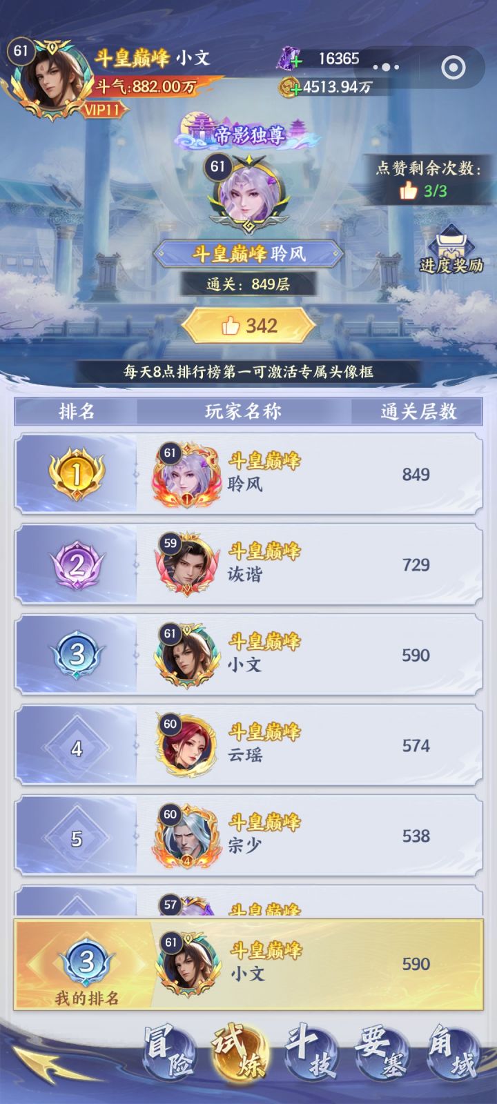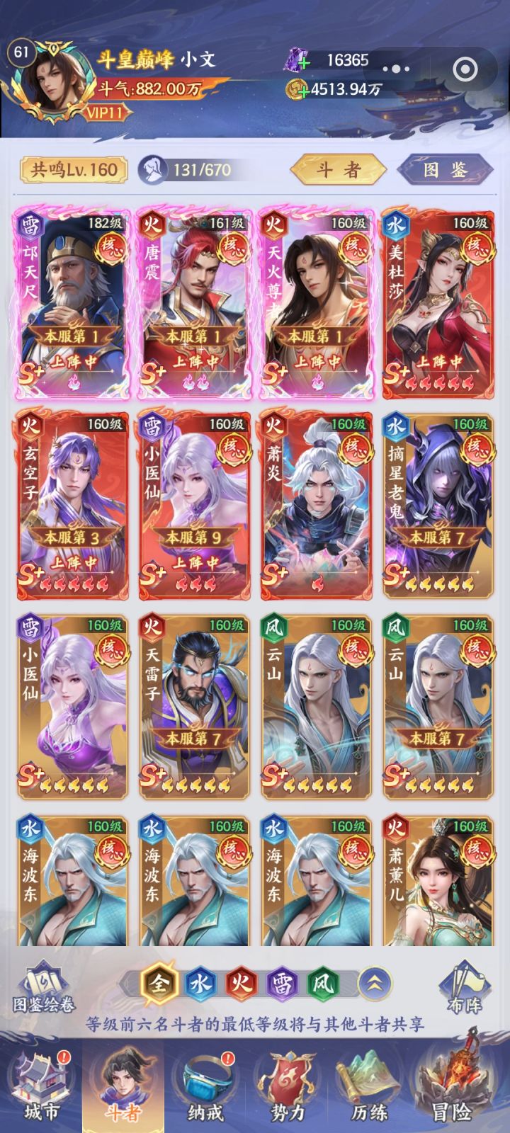 昨天听大伙的意见,还是决定不拉萧炎了,先这个阵容用着,等传说萧炎出来再拉传说萧炎,就是可惜了新服第三天那个炎帝破境的活动,我没拉萧炎拿不到奖励。现在太缺进阶石了,不缺本体不缺狗粮,进阶石够我就能全拉到粉彩,可惜缺口太大了