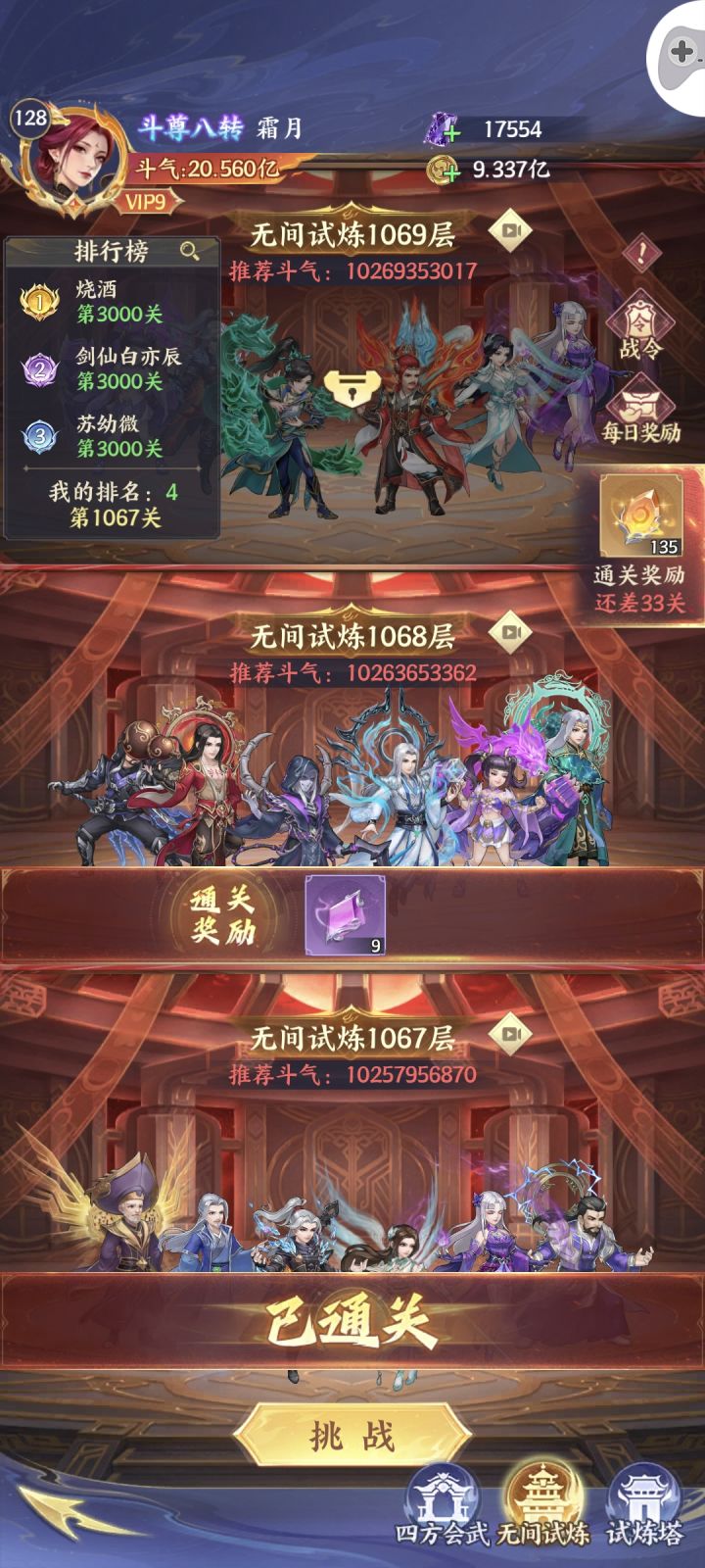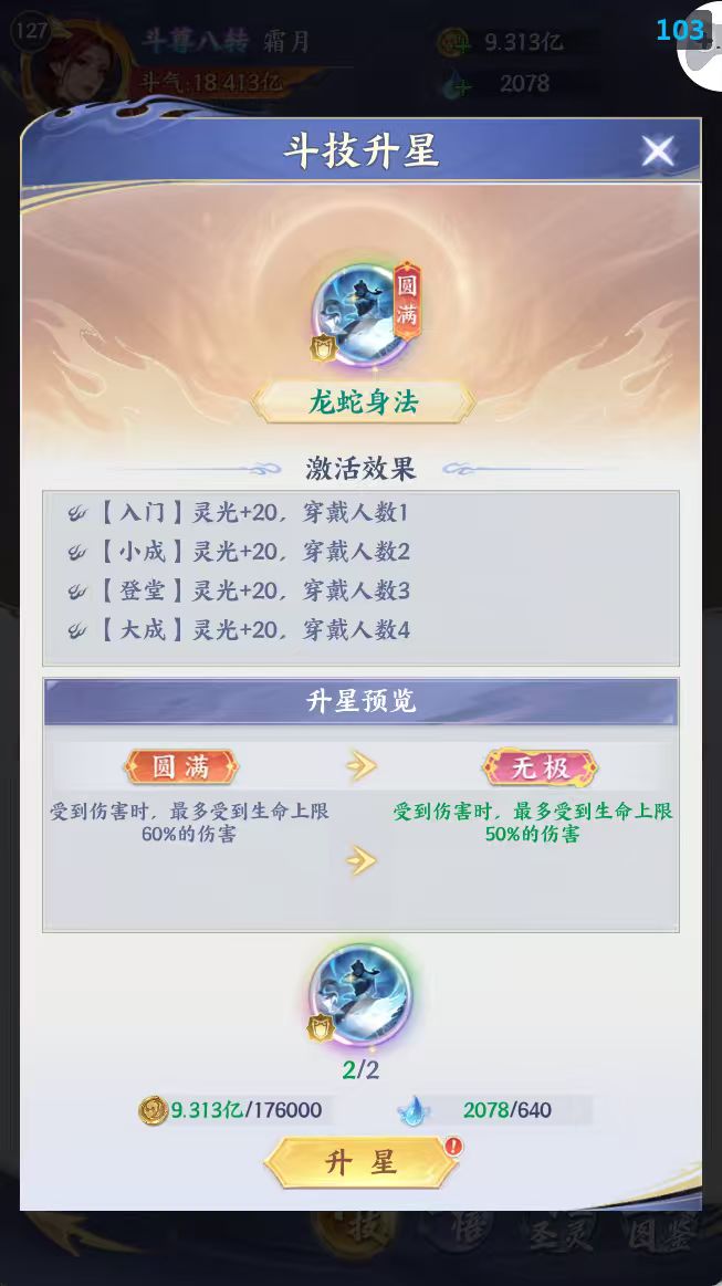 论龙蛇身法的重要性,斗技达标换了4个龙蛇从大成拉到无极,遗迹直接把今日可通关次数打完来到2900,无间试炼也从200+来到了1000+
