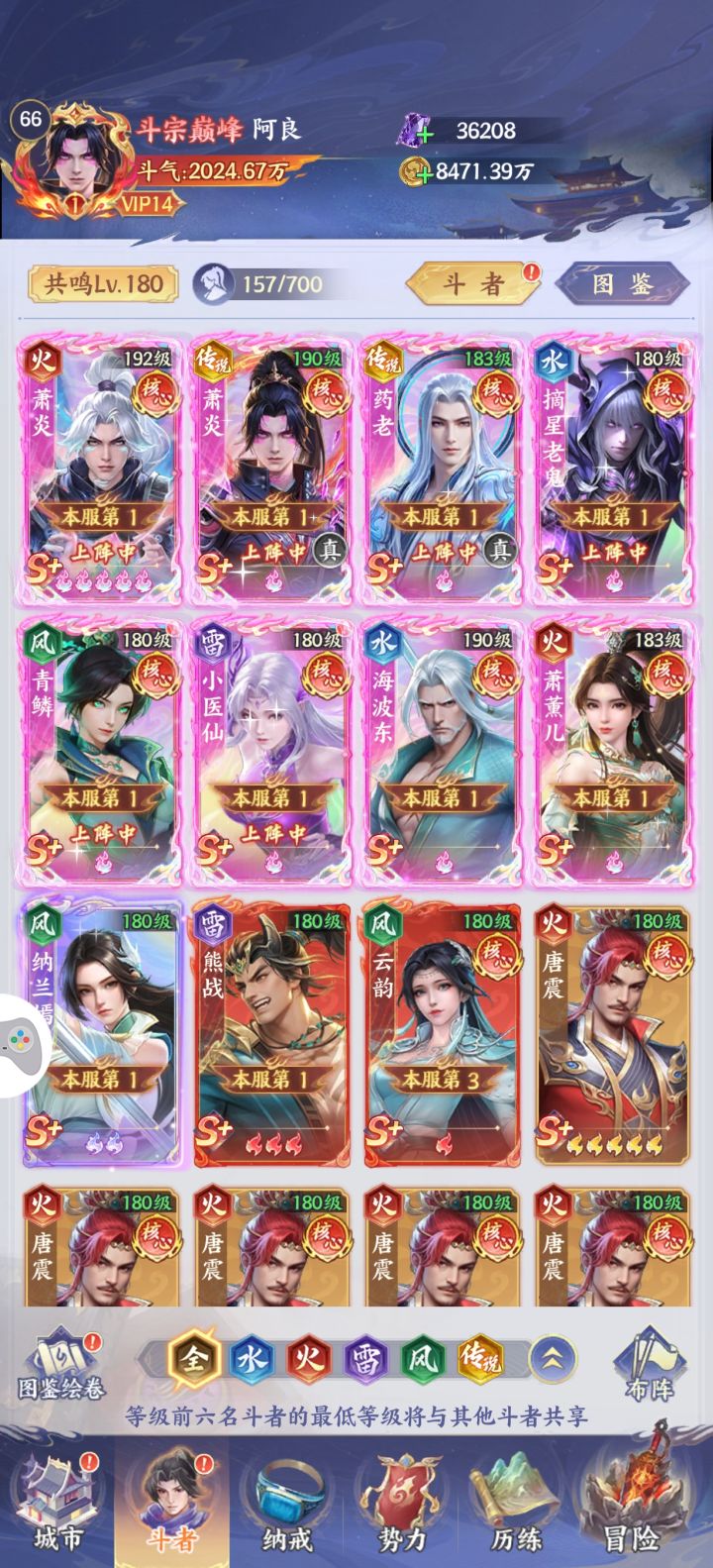 萧炎第四天就可以帝境了,之所以没升是考虑收益最大化,彩5可以吃到炎帝活动满奖励.升帝境的本体可以后边慢慢等抽到白嫖.其余4个小娘们全彩1是为了解锁天赋,目前萧炎站在5号位=======第一回合轮到他出手时可达16怒气.========至于这个熊战纯冲人数的,钻3正好后边给萧炎当狗粮升帝境.爬塔轻松越战接近一倍战力,毋庸置疑的简单粗暴目前PVP一拳超人,任何队伍即使同战力也是全屏秒杀,火