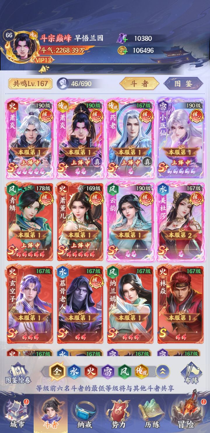 萧炎第四天就可以帝境了,之所以没升是考虑收益最大化,彩5可以吃到炎帝活动满奖励.升帝境的本体可以后边慢慢等抽到白嫖.其余4个小娘们全彩1是为了解锁天赋,目前萧炎站在5号位=======第一回合轮到他出手时可达16怒气.========至于这个熊战纯冲人数的,钻3正好后边给萧炎当狗粮升帝境.爬塔轻松越战接近一倍战力,毋庸置疑的简单粗暴目前PVP一拳超人,任何队伍即使同战力也是全屏秒杀,火