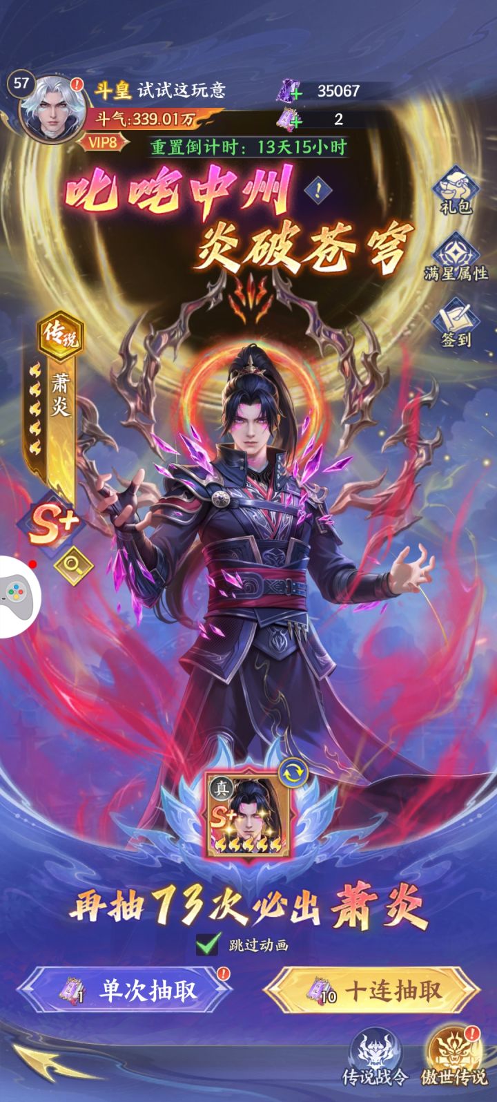 签到领的10连抽直接就给了,想问下大家是继续抽萧炎还是换药老?我白嫖的,前面就充了首充6元加30元120抽那个,后面也会偶尔充个6元或者30元,然后后面6天签到领40次加每日礼包好像不够73次保底啊