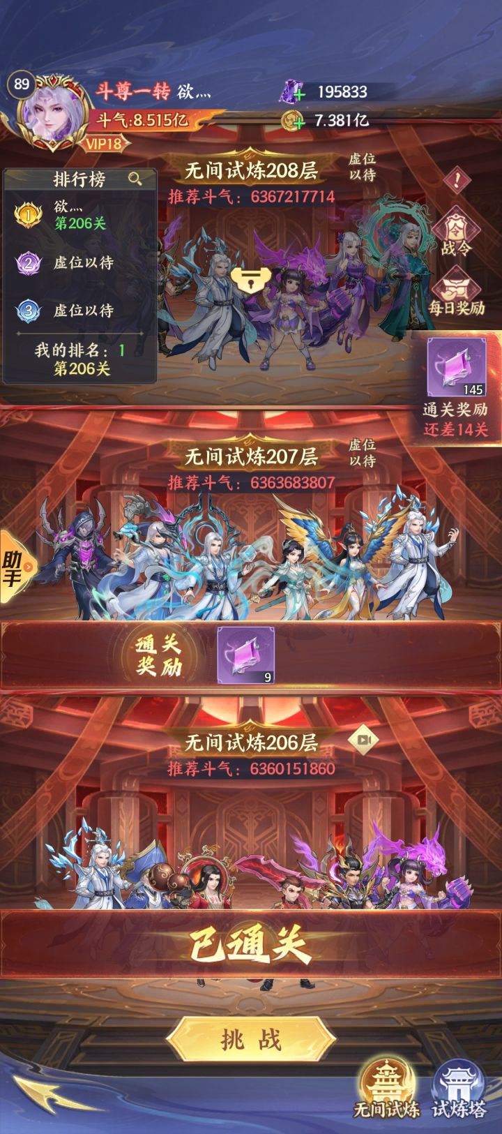 间歇性发贴,第二十二天,氪了三十块,把凤清儿回退了,换了青鳞上阵,试炼塔一路猛推,从1100层到1350层了。 感觉脑子有点抽了,看着海波东有六个了,直接升到了粉一,一开始觉得帅而已,现在想想上阵六个角色就够了,上粉一干啥,损失一大波狗粮,靠时间平账吧,就这么玩这吧。 后面先把传萧拉粉三,准备小医仙换传说云韵,听说传说紫妍很能抗,但是我不知道传说紫妍换哪个,毕竟传说云韵是小医仙的