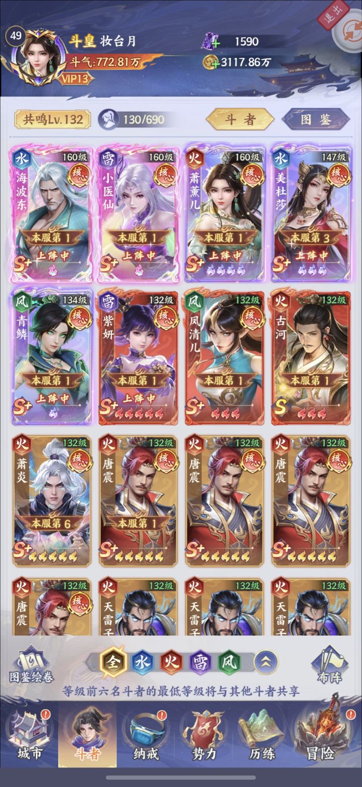 昨天听大伙的意见,还是决定不拉萧炎了,先这个阵容用着,等传说萧炎出来再拉传说萧炎,就是可惜了新服第三天那个炎帝破境的活动,我没拉萧炎拿不到奖励。现在太缺进阶石了,不缺本体不缺狗粮,进阶石够我就能全拉到粉彩,可惜缺口太大了